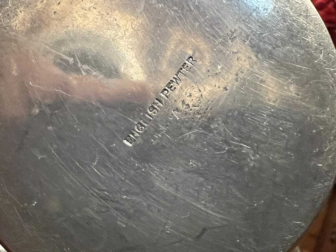 壺身底部刻有 “ENGLISH PEWTER”,為英國錫器的典型標記。整體無飲用痕跡、僅見純錫材質自然存在的小凹痕,屬正常老件狀態。純錫因其穩定性,可正常裝水或花材使用,也非常適合作為風格靜物與空間擺飾。