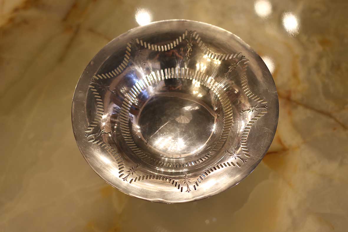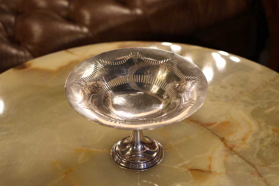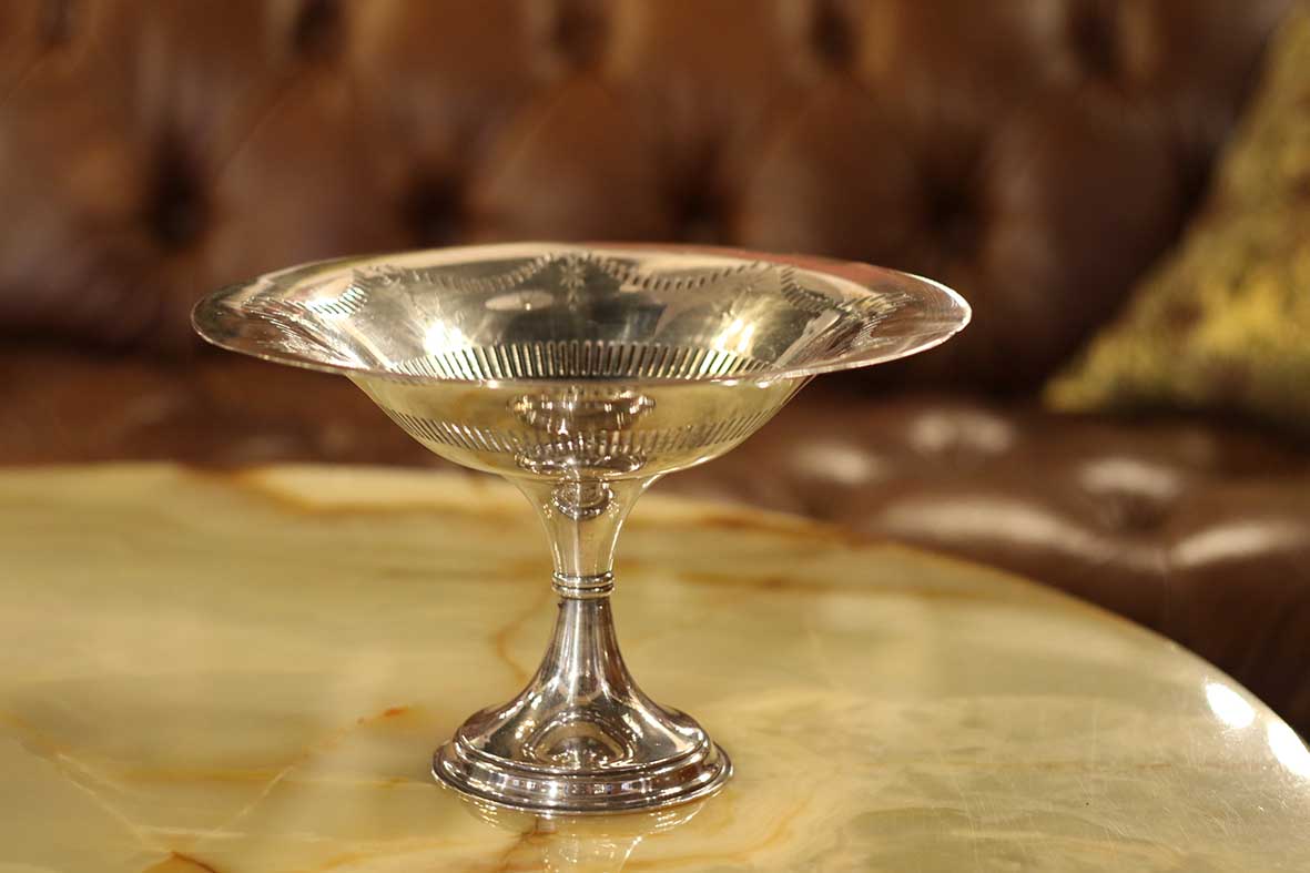 這件英國古董高腳盤以鍍銀製成,整體造型優雅挺拔,底座比例勻稱、線條流暢。盤面採淺碟型設計,四周以手工鏤空雕刻與壓紋刻飾構成波浪狀邊緣,光影流轉間閃耀細膩金屬質感。