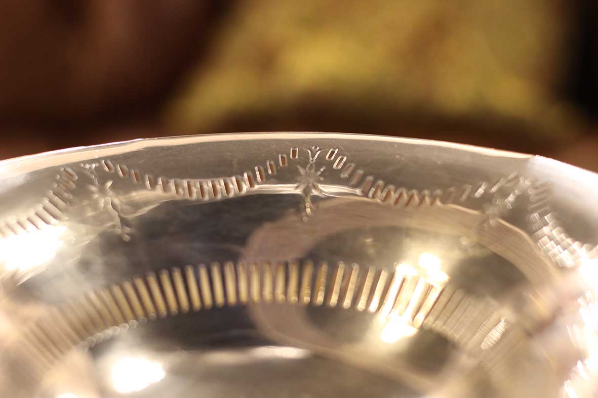 從底部的英國銀器標記可辨,有完整的工坊印記,星形標章及字母樣式顯示為20世紀初英國銀器工坊出品,當時多用於高級宴會或茶會甜點、水果擺盤使用。手工細密刻線,盤壁上的對稱鏤飾圖樣為傳統英式新古典風格的經典代表。