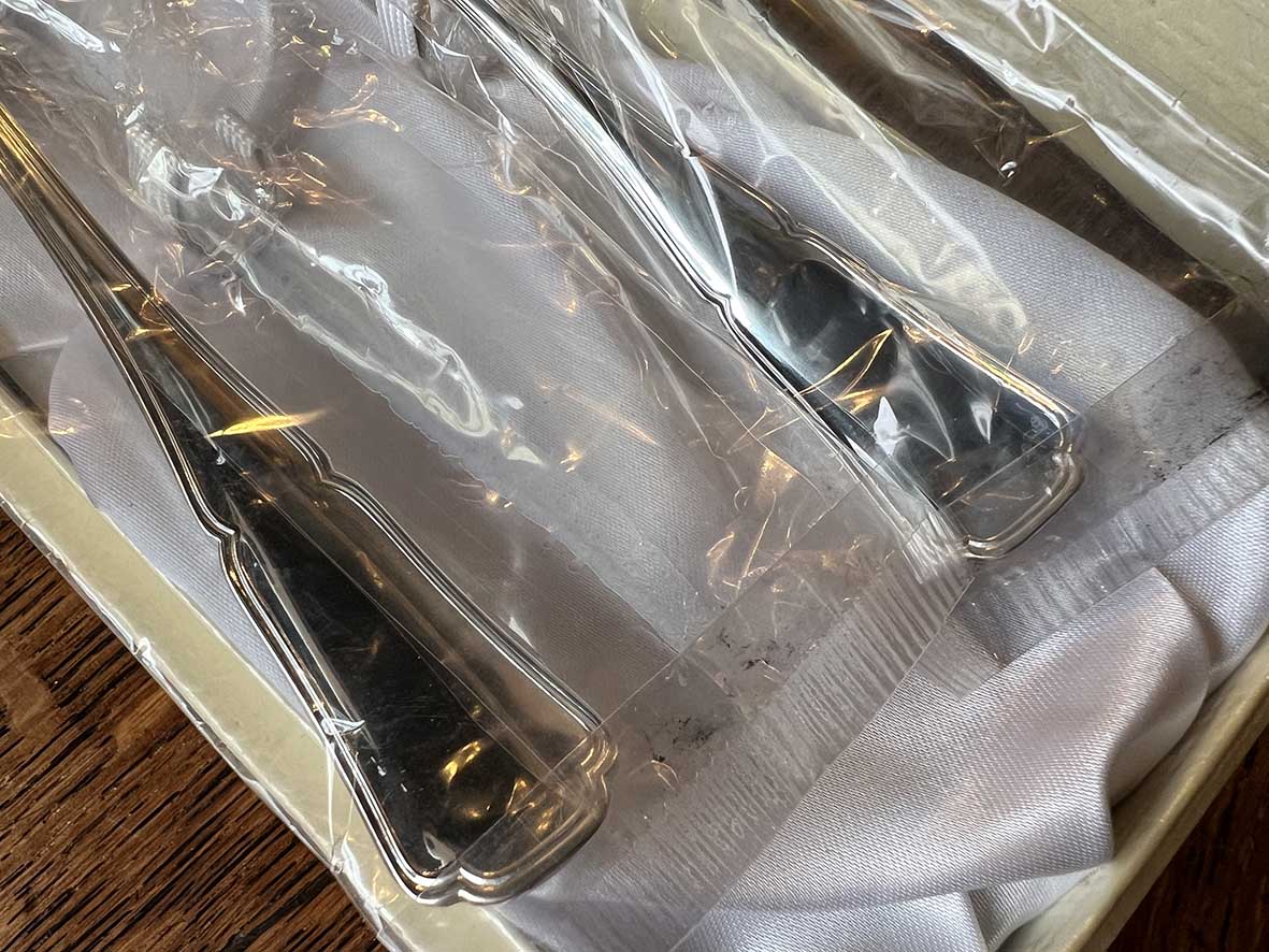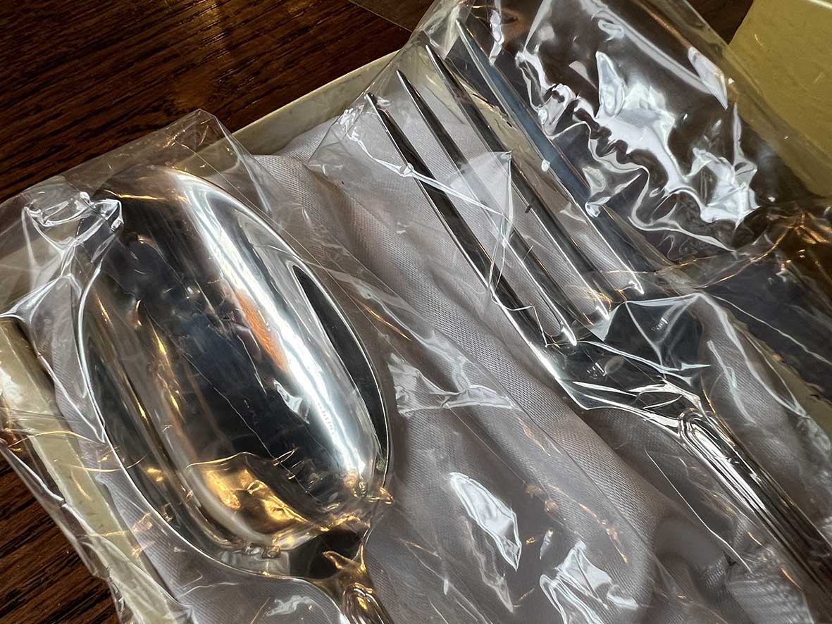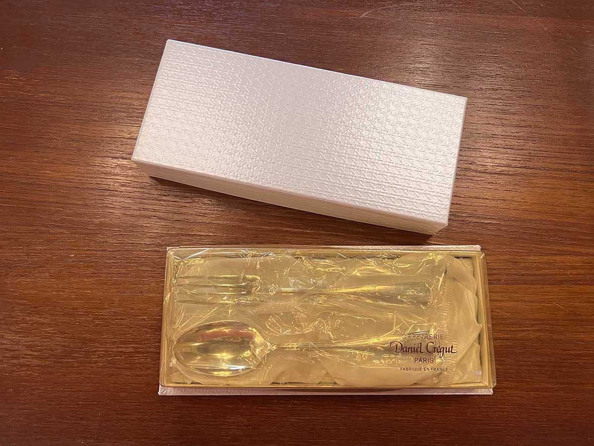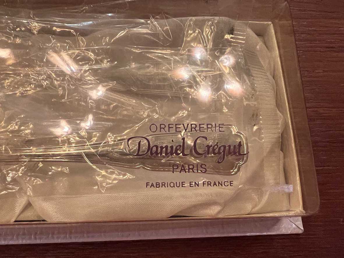 這件來自巴黎的 Daniel Crégut Orfèvrerie 餐具組,為純銀打造,內含餐叉與餐匙各一件,原裝未拆封保存於禮盒中。