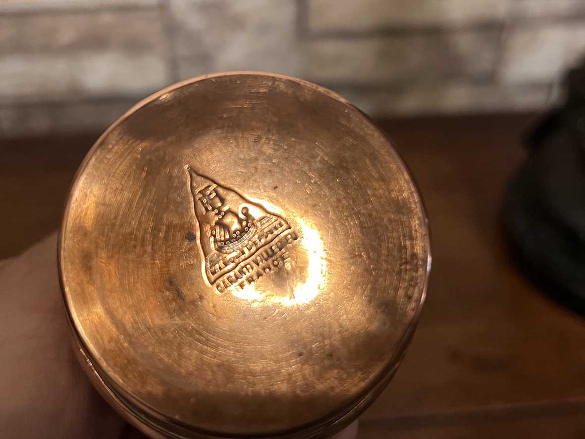 此壺以 紅銅壺身 為基底,層層環繞著 黃銅飾環,搭配黃銅把手,造型呈現典雅的階梯狀比例。壺底清晰壓印 Villedieu 工坊印記,象徵其純正法國工藝出身。