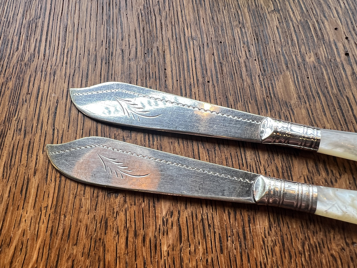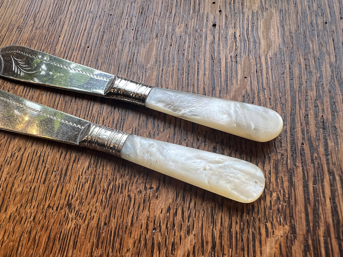 這組來自英國的古董奶油刀,為十九世紀末的典雅手工餐具。刀身刻有細緻的葉紋雕花,並標有 E.P.N.S.(Electro Plated Nickel Silver) 鍍銀標記;手柄以天然珍珠母貝製成,隨光線呈現柔和虹彩,是維多利亞時期餐桌禮儀與審美的象徵。