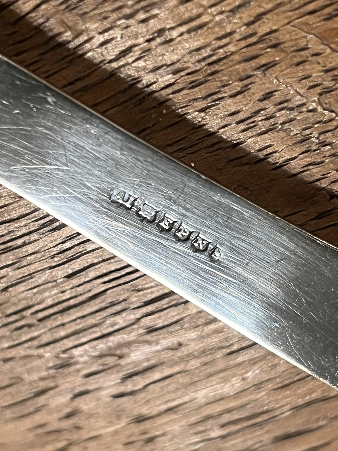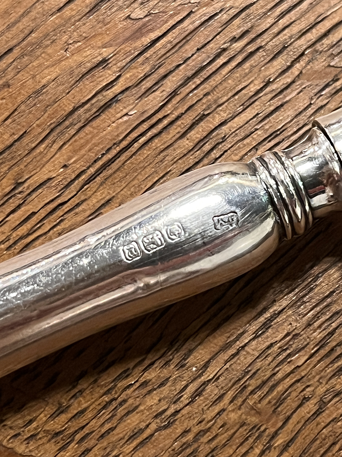 刀柄與刀身皆帶有清晰的英國銀器印記,為該時期典型的鍍銀手工製品,展現出倫敦工坊的經典工藝水準。