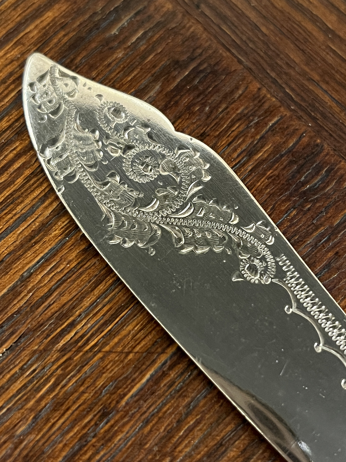 這款 英國古董鍍銀刻花奶油刀(約 1900–1910 年),刀身佈滿維多利亞時期常見的精緻刻花紋飾,從花葉到蕾絲邊框皆以手工雕刻呈現。銀器表面柔和的光澤帶有歲月沉澱的質感,是古董刀叉中非常迷人的品項。