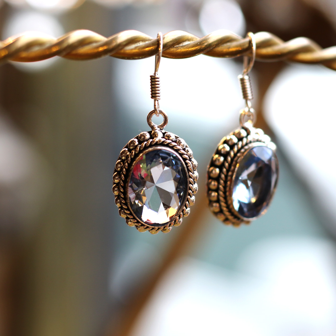 這對耳環展現出濃厚的英式懷舊氣息,主石為橢圓形切割的紫水晶(Amethyst),顏色呈現淡紫至淺藍調交錯的冷色光感,在燈光下閃爍出細膩火彩。石面經典玫瑰式多面切割,使光線於每個角度中折射,極富立體感與通透度。
