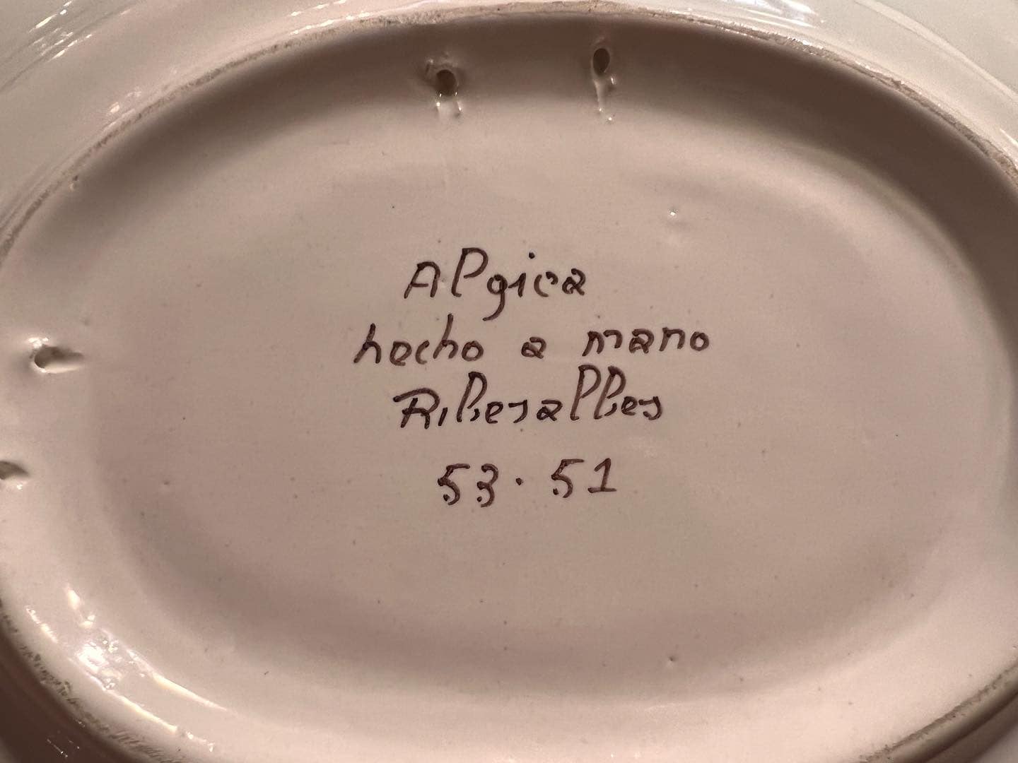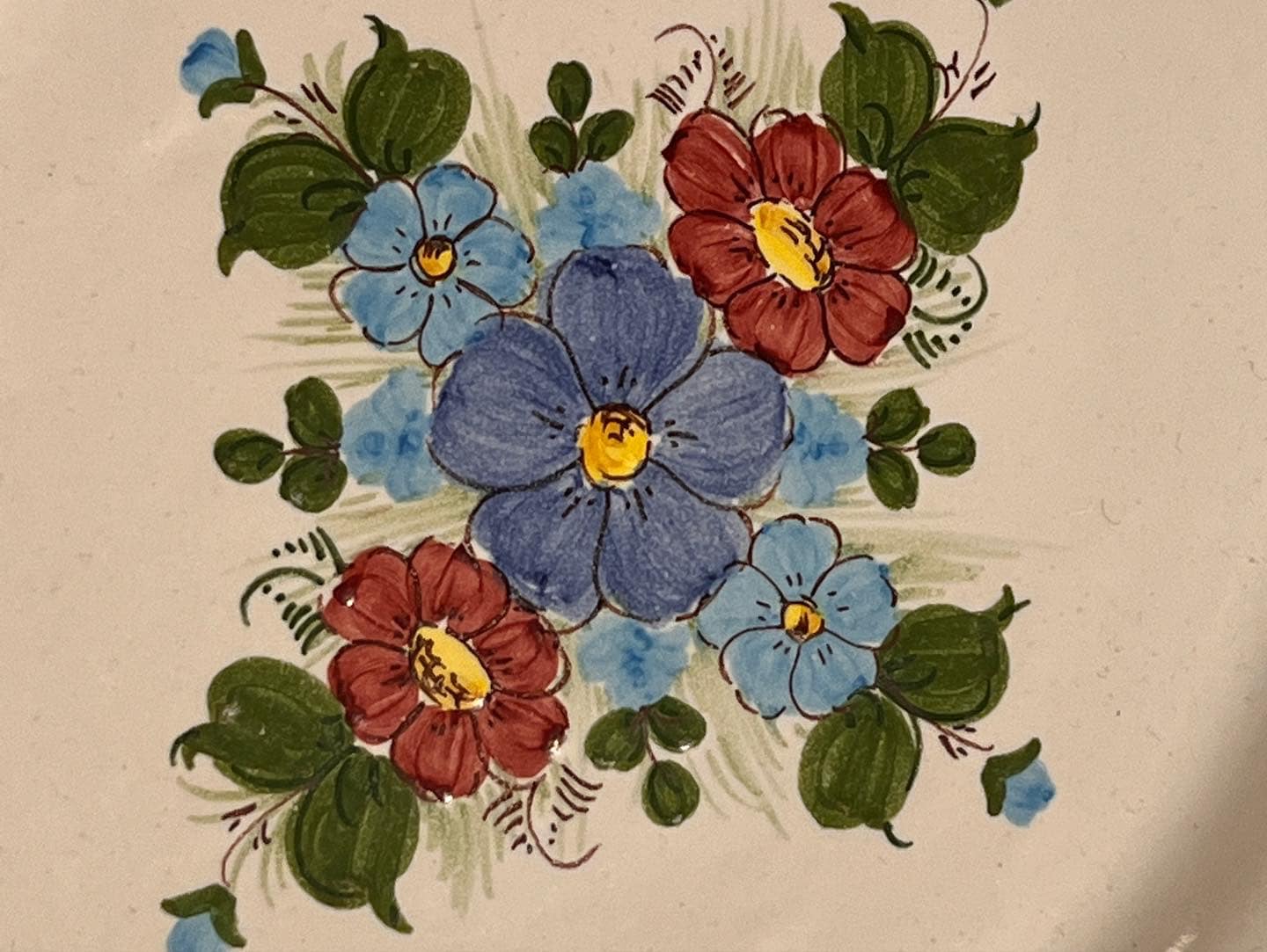 這件來自葡萄牙的手工手繪瓷盤,以鮮明的藍、紅、綠色花卉組合搭配波浪邊描邊,呈現地中海式的溫暖鄉村感。盤面由畫師手繪製完成,背面可見手寫款識「APGica hecho a mano Ribeiraplbes 53.51」,屬於小工作坊少量製作的手工藝品,十分具收藏與展示價值。