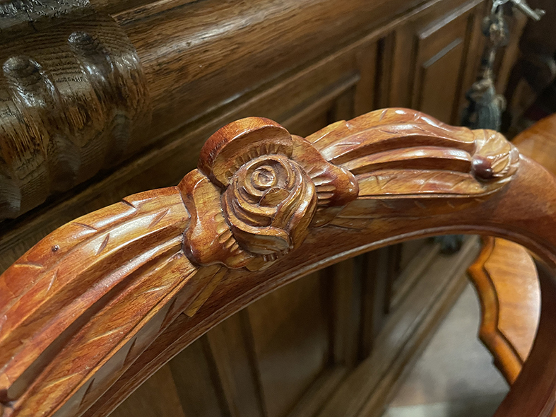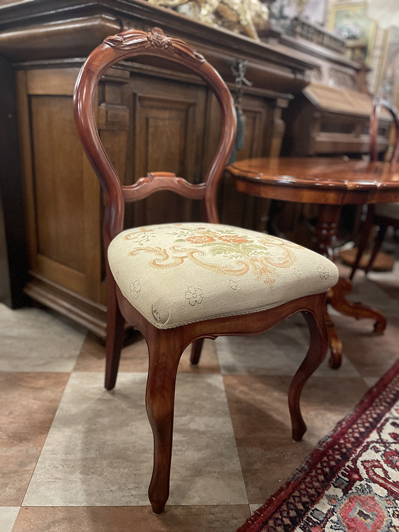 這件來自英國的優雅餐椅,19世紀中葉維多利亞時期的風格,椅背採用經典的「氣球背」輪廓,搭配頂端細緻雕刻花飾,呈現出當代精緻木作工藝的代表性特徵。整體以桃花心木打造,木紋流暢溫潤,呈現濃郁的紅棕色光澤,兼具結構穩定與視覺美感。