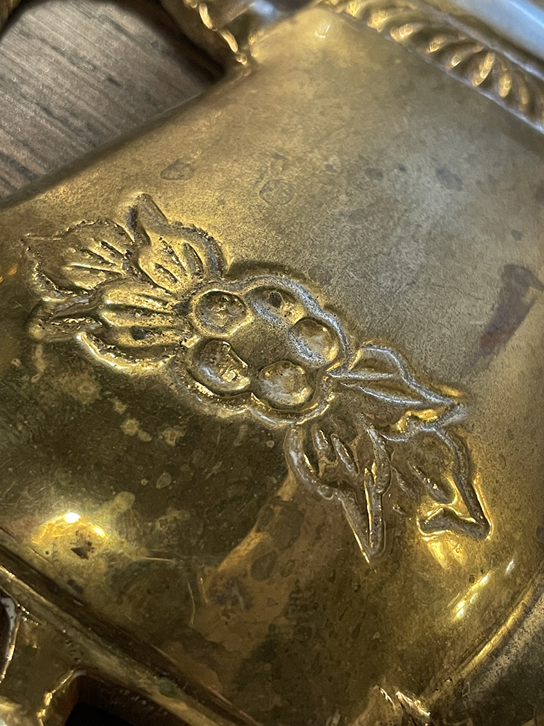 這件英國製的茶壺造型掛鉤,以黃銅打造,外型呈現典雅的茶壺輪廓,壺身中央花卉浮雕,增添一絲鄉村手工的溫潤氛圍。底部有三個實用掛鉤,可用於懸掛鑰匙、餐具、抹布或小飾品,既具裝飾性又兼顧收納功能。