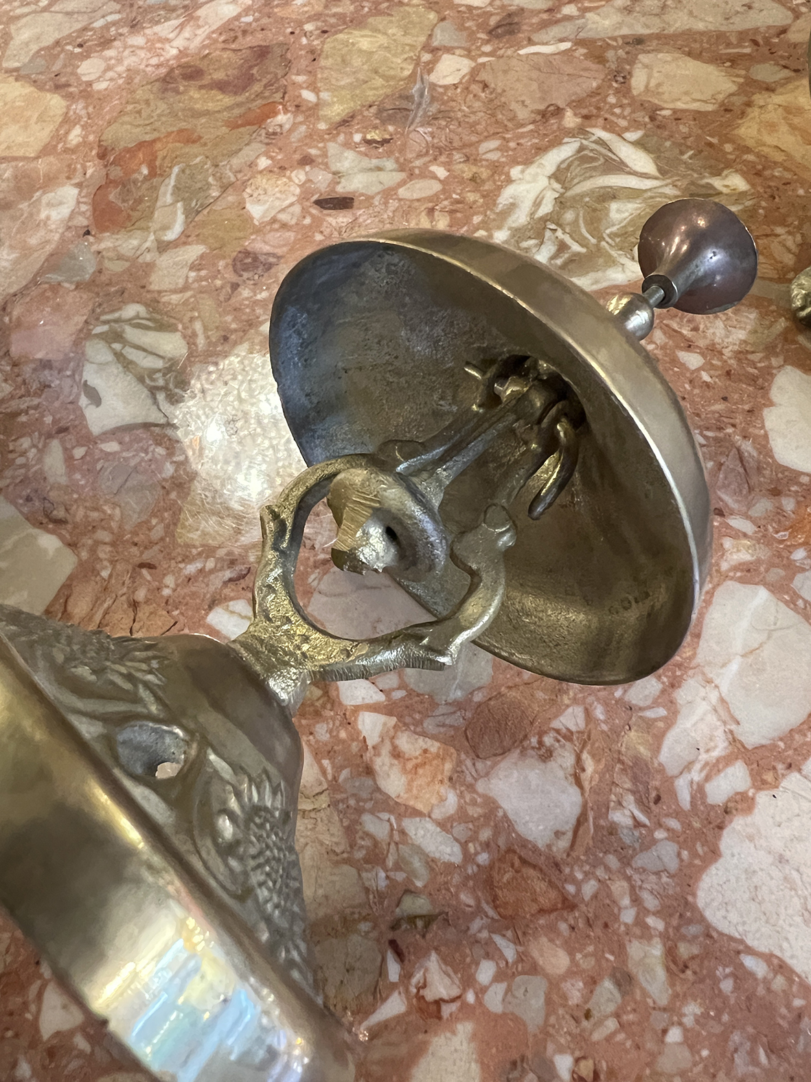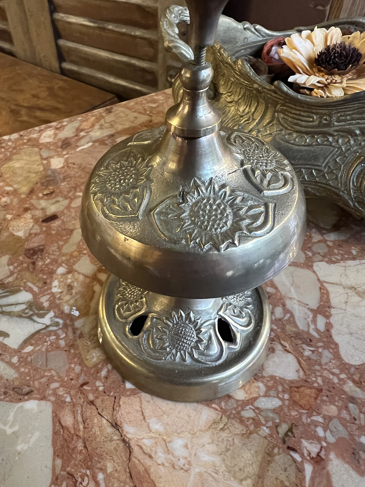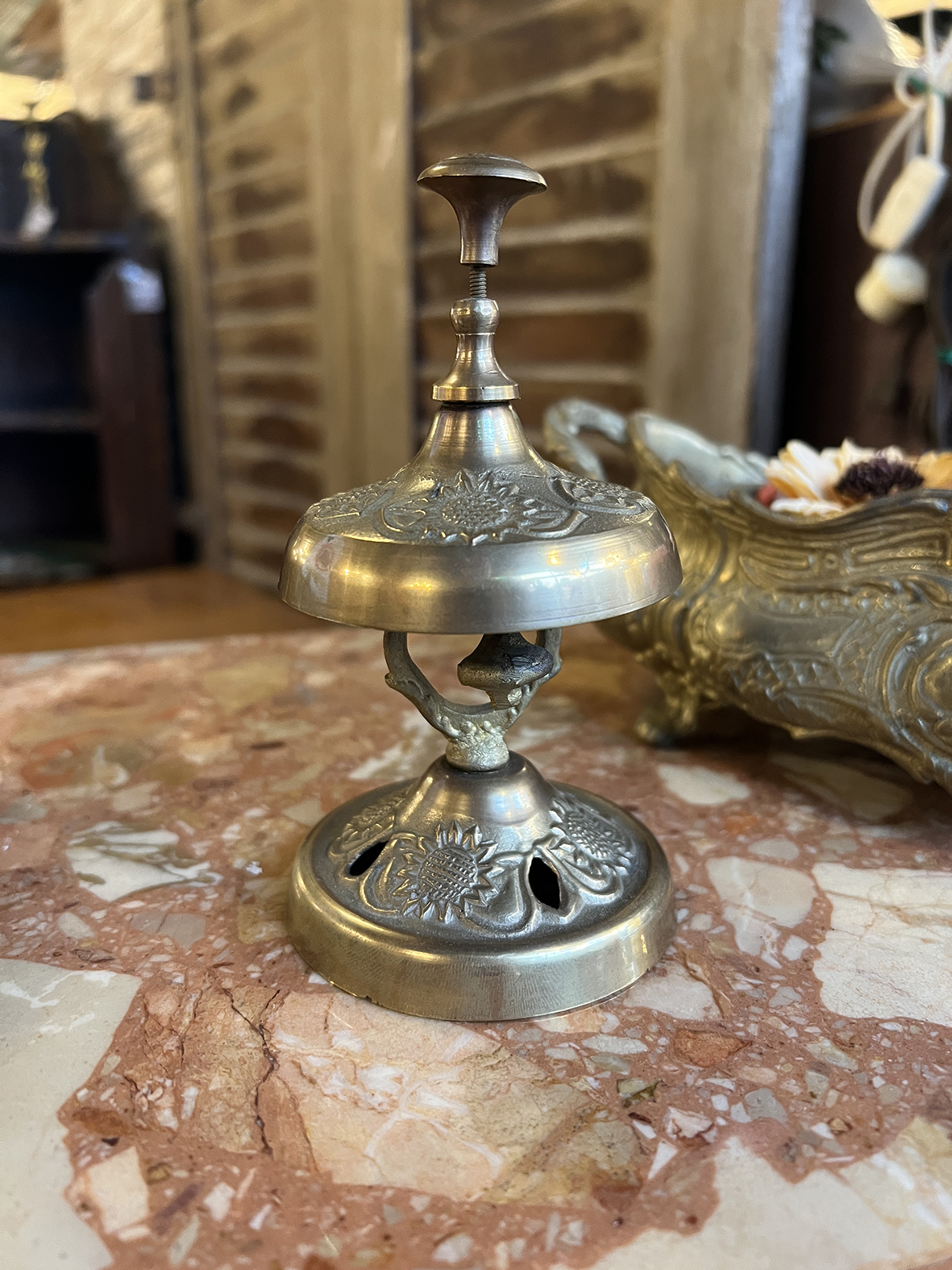 #法國古董 #古董酒店鐘 #黃銅老件 #法國老物 #歐洲古董收藏 #桌上風景 #書房擺飾 #老旅館風格 #古董小物件 #向日葵浮雕 #金屬工藝 #古董鐘 #復古空間 #選物店風格 #靜物收藏 #antiquebell #frenchantique #vintagebrass #hotelbell #antiquedecor #europeanantiques #collectorsitem #vintageinterior #deskdecor