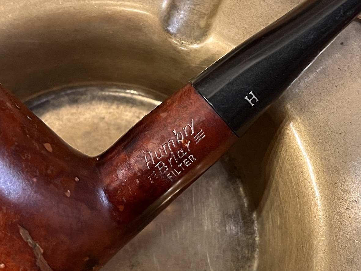 煙嘴上刻有 「H」 字樣,木身亦清晰標示 「Humbry Briar FILTER」,為品牌辨識的特色之一。斗體帶有自然棕紅色澤,並可見歲月使用痕跡,展現獨有的溫潤陳年質感。圓潤經典的造型搭配手工木紋細節,無論實用或收藏皆具價值。