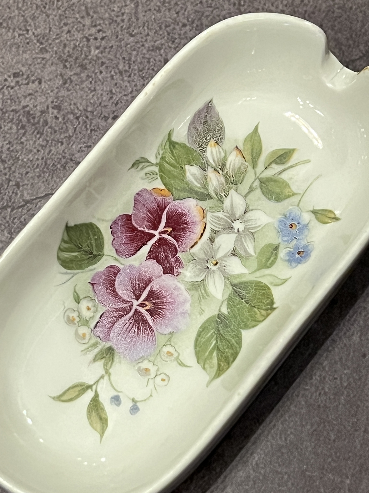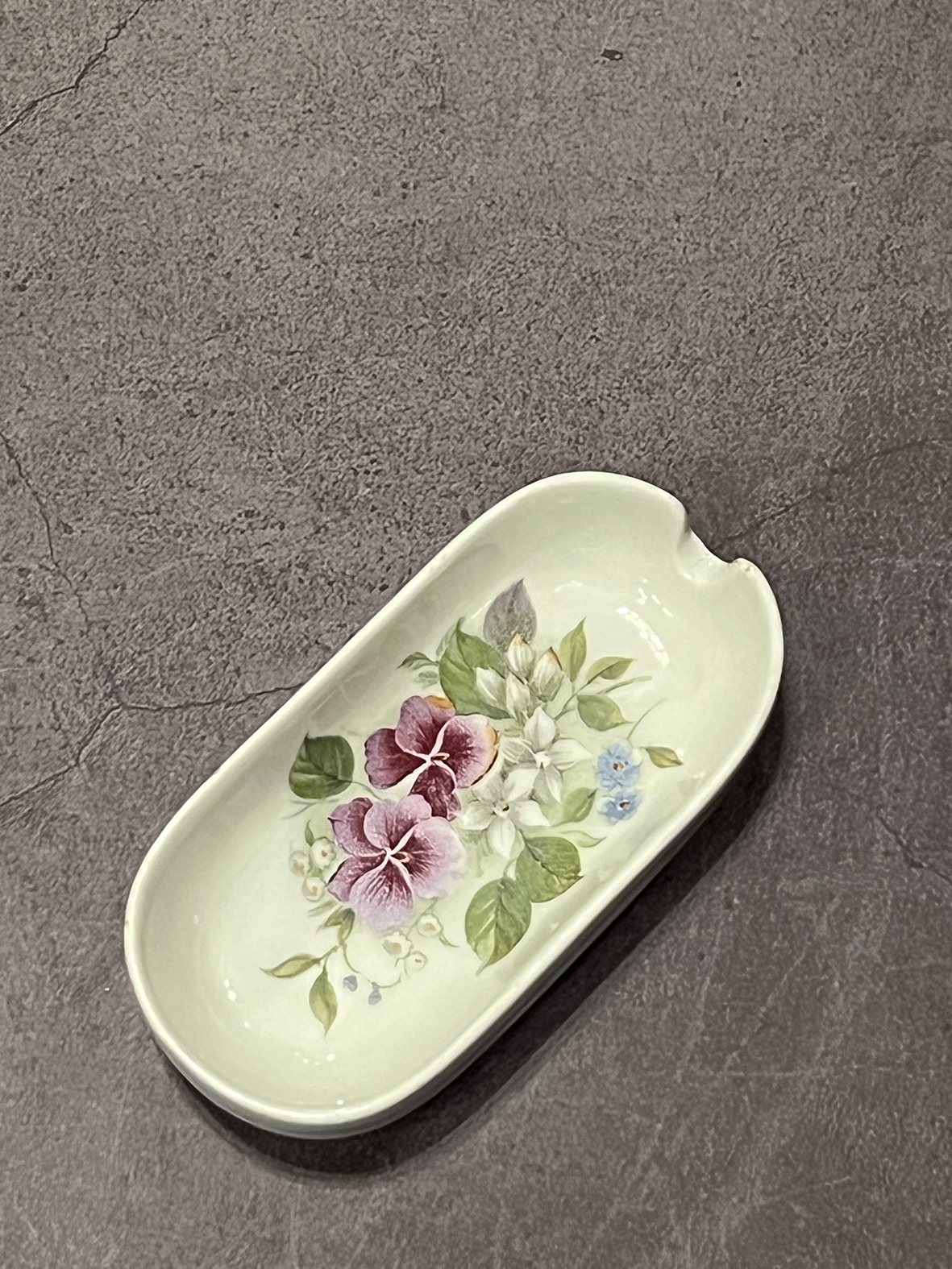 這件來自法國 Limoges 的小型骨瓷器物,呈現橢圓形器身,原設計為煙灰缸,但亦可作為茶包碟或茶匙碟使用。器內以細膩的手繪花卉為主題,粉嫩的三色堇搭配白色小花與嫩葉,構成優雅柔美的構圖,展現出Limoges工坊一貫的高雅氣質。