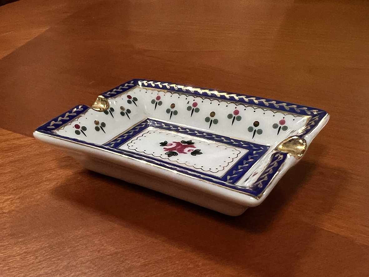 這件茶包碟(或作茶匙承盤、迷你煙灰缸)出自 Limoges Style,以純白瓷為基底,中央繪有手工粉紅玫瑰花卉,周圍點綴成排小花,搭配皇家藍色框飾與金葉藤蔓描邊,層次華麗而不失典雅。