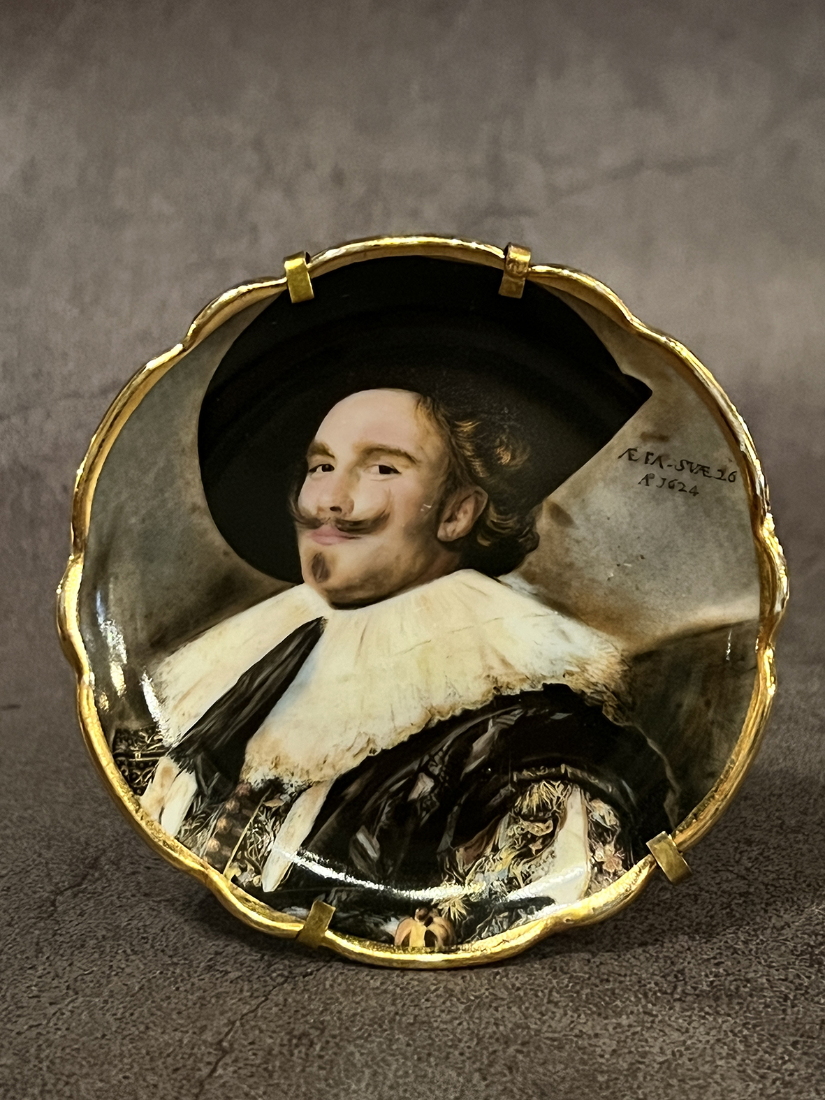 這件 Limoges Le Roy 出品瓷盤,以細緻手工描金工藝,重現了 Frans Hals (1624) 的傳世名作《微笑的騎士》。