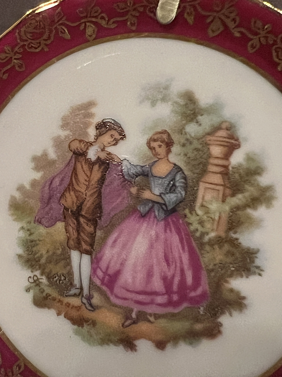 這件 Limoges 瓷盤,展現了18世紀宮廷戀人風格的經典場景:一對青年男女在花園中依偎對話,色彩柔和而細膩。