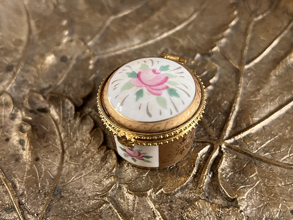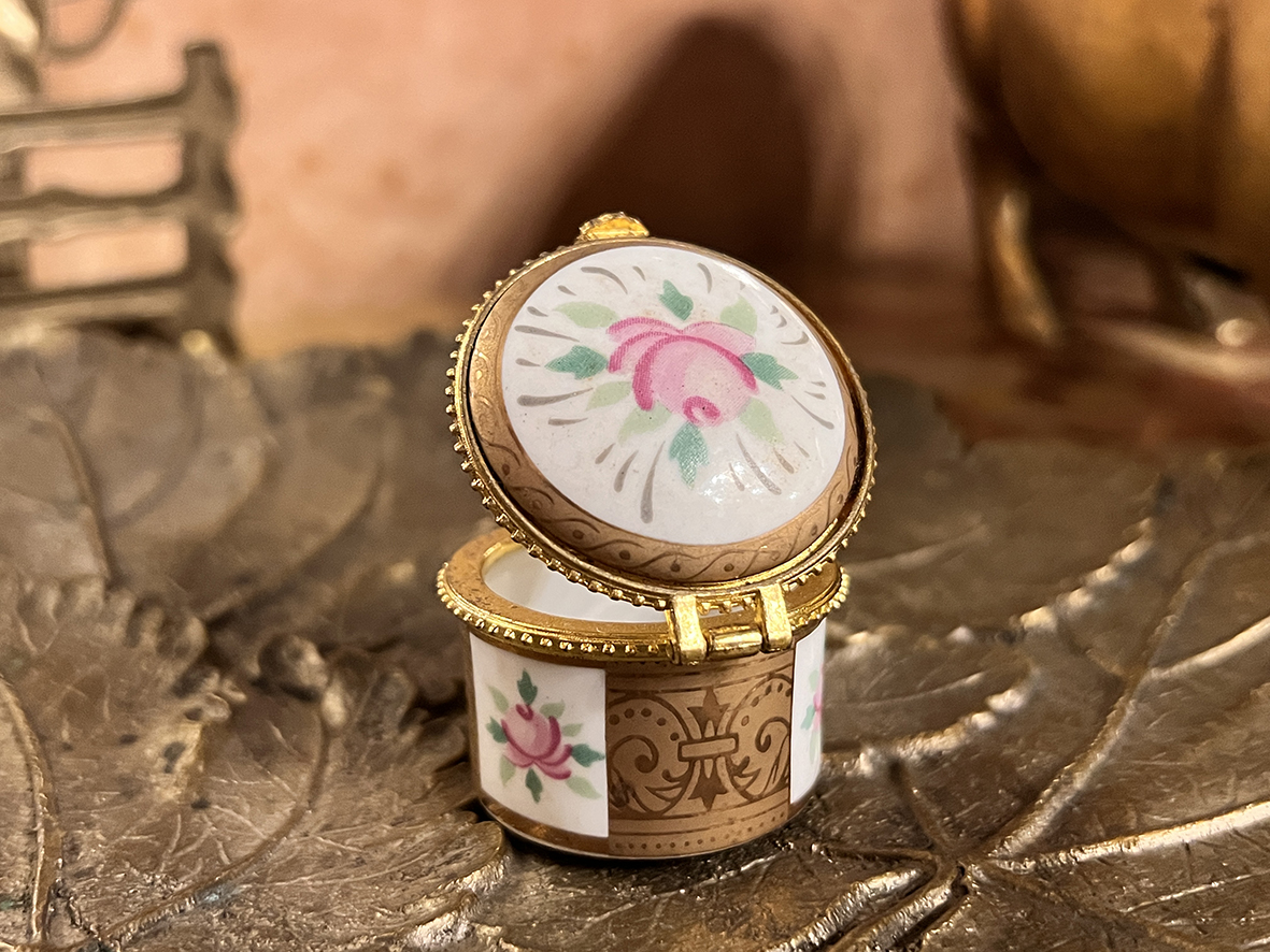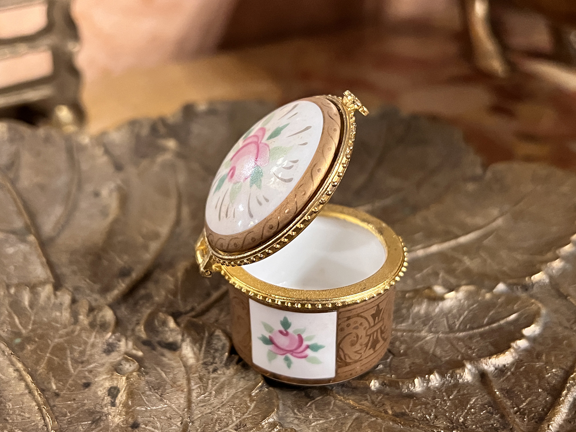 這件小型瓷盒來自英國,為手工繪製玫瑰花卉主題,搭配描金邊飾與細膩的黃銅鎖扣。