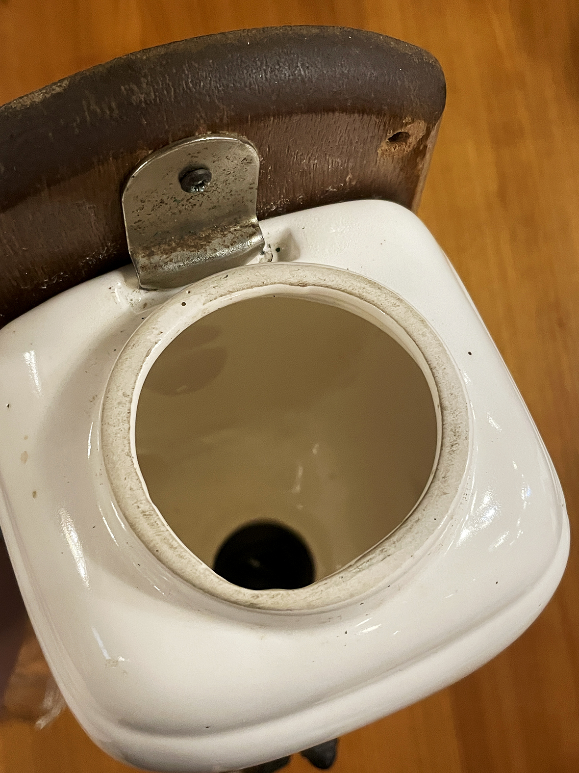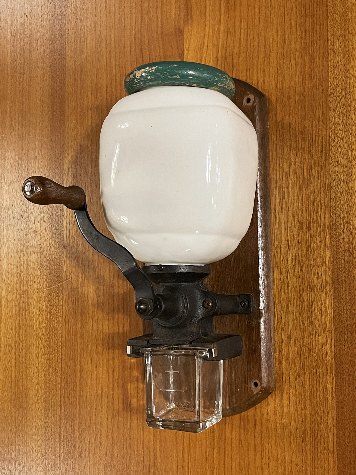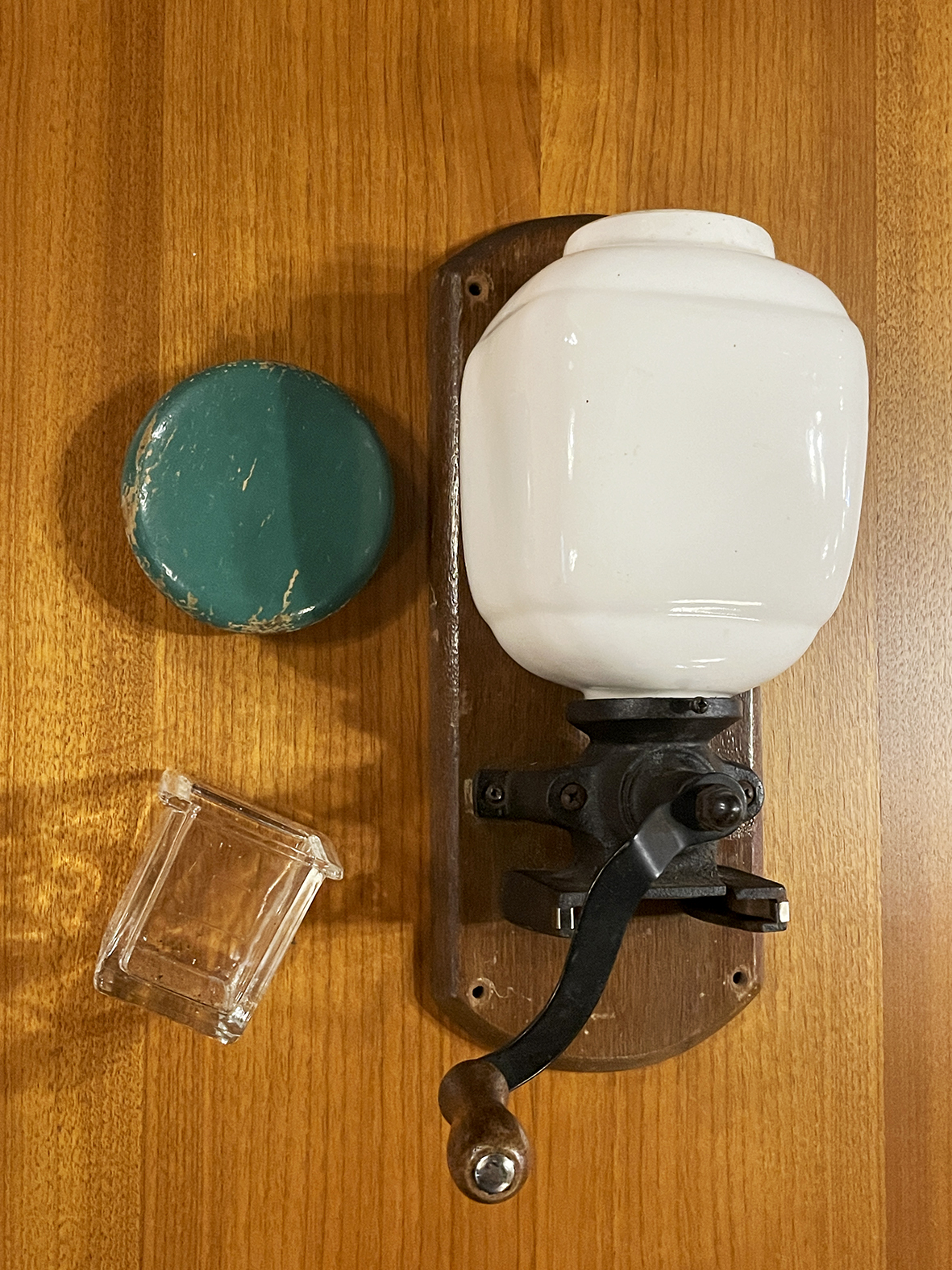 上方為厚實高溫燒製的白瓷豆罐,釉面光潔無紋,觸感細膩。原始綠色木蓋留有自然使用磨耗,呈現典雅歲月痕跡。中段的黑色鑄鐵磨芯機構結構扎實,轉動木柄即可輕鬆研磨咖啡豆,粉末則落入下方的厚玻璃粉盒中。
