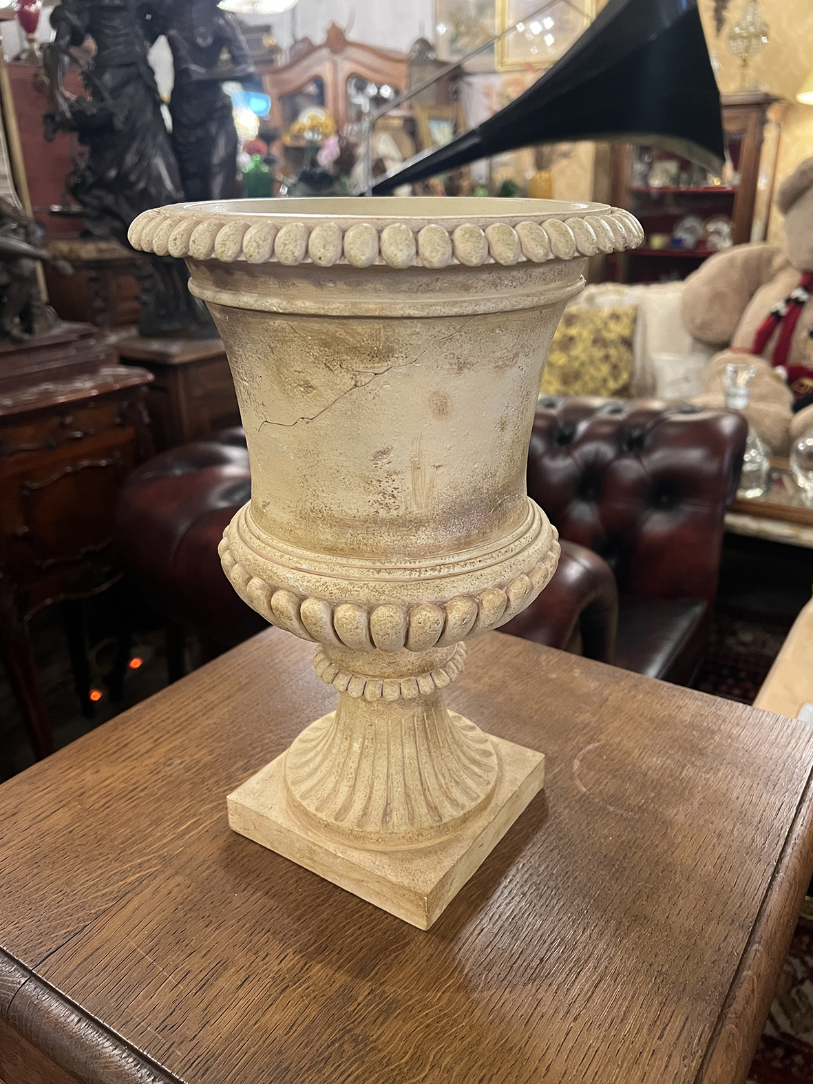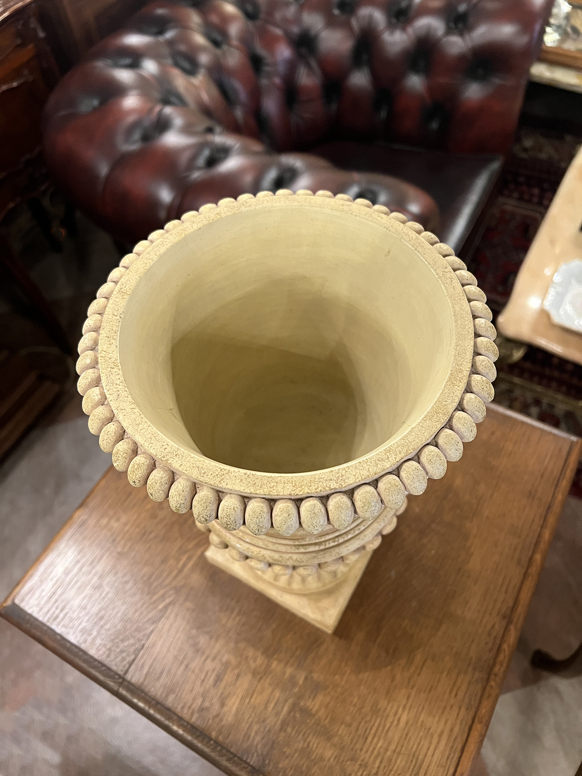 外翻口沿、自然收腰的 urn 輪廓,搭配連續珠飾雕刻,視覺節奏穩定而克制;下方柱腳與方形底座,讓整體重心下沉,即使空盆擺放,也依然有「建築感」的存在。
