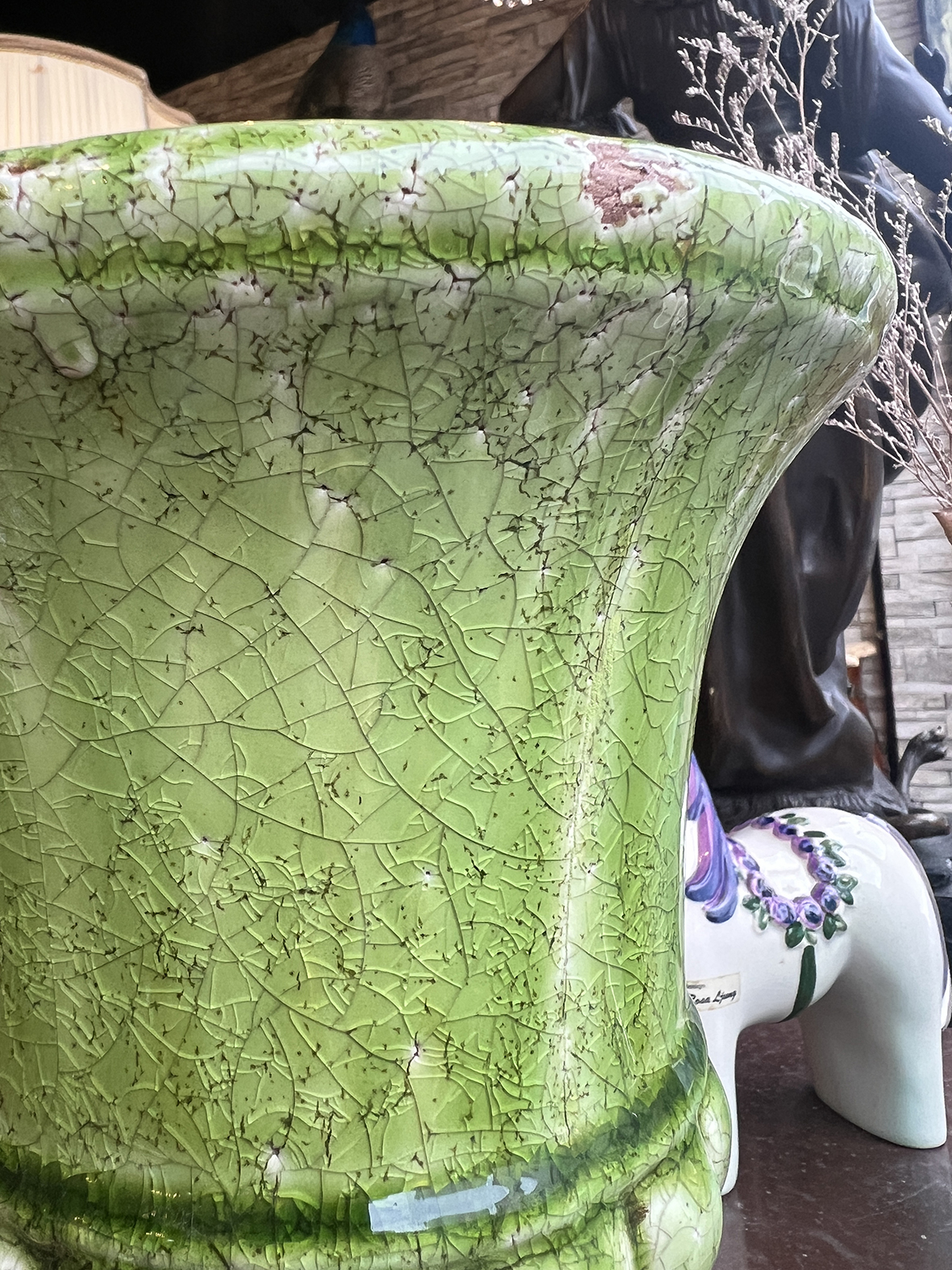 整體施以溫潤而層次豐富的法國綠釉,在長時間使用與環境變化下,釉層自然產生細密交錯的紋理。這些紋路並非刻意設計,也不是為了效果而燒製,而是陶瓷在歷史中經歷冷熱、濕度與時間推移後,自然形成的結果。