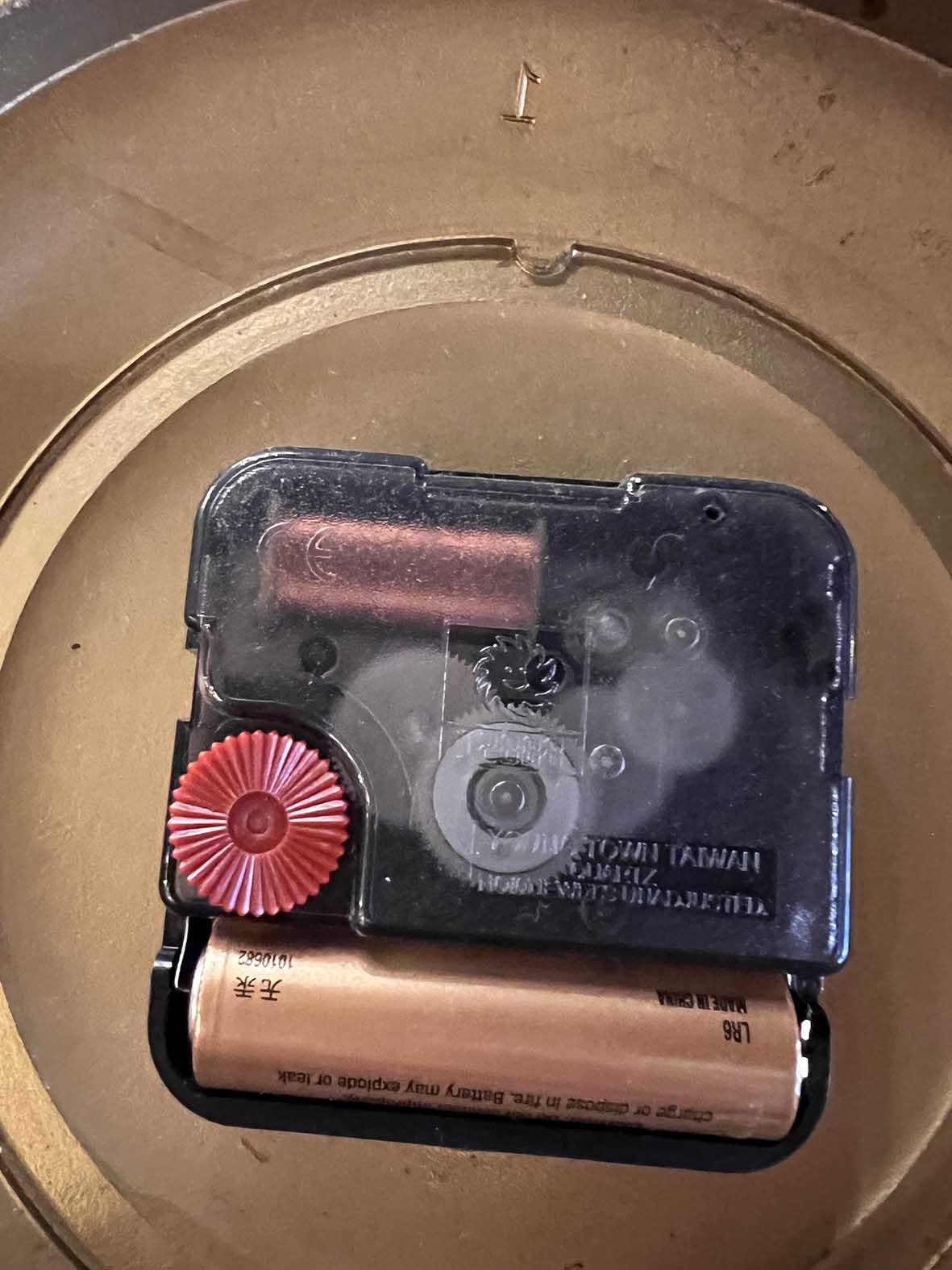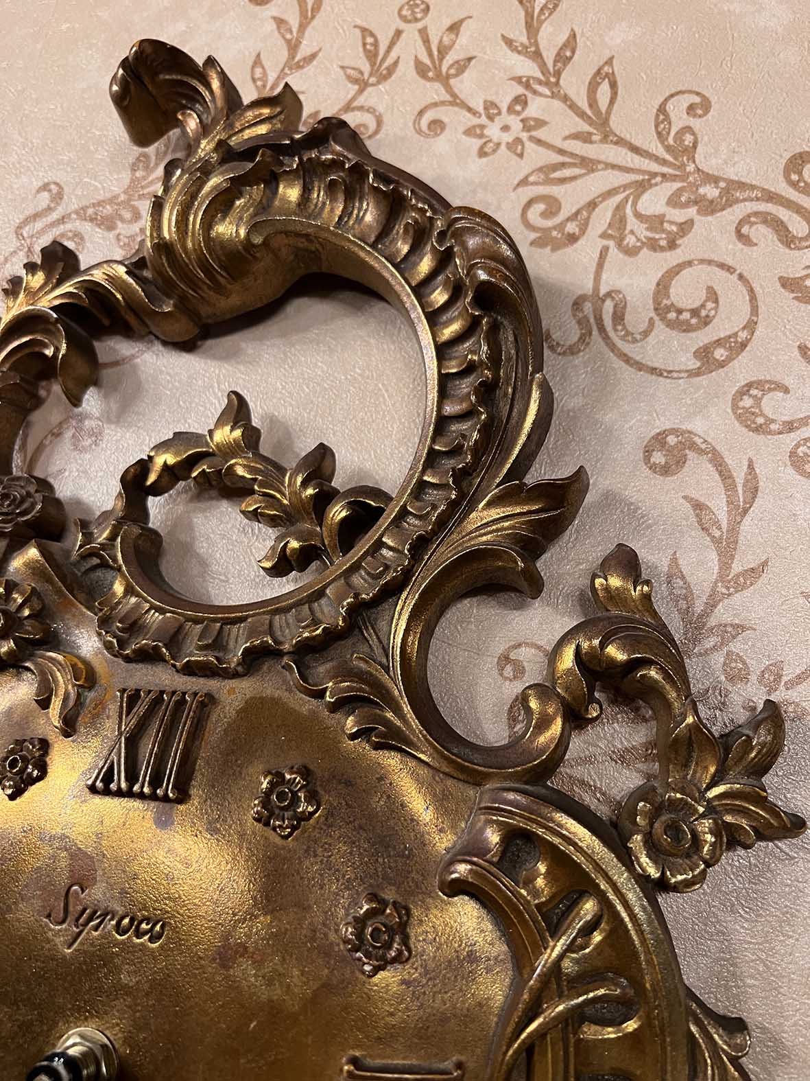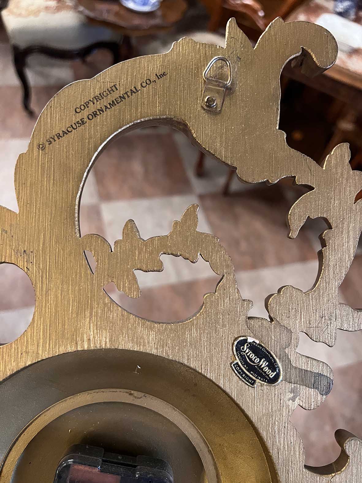 Syroco 以早期「模壓木粉混合纖維」技術聞名(Syroco Wood),此掛鐘厚實有份量,非輕質塑膠製品。表面以金色塗層處理,歷經歲月自然產生溫潤古銅色澤。鐘面保留原始浮雕羅馬數字與花飾,背面清楚印有「SYRACUSE ORNAMENTAL CO. INC.」標記。