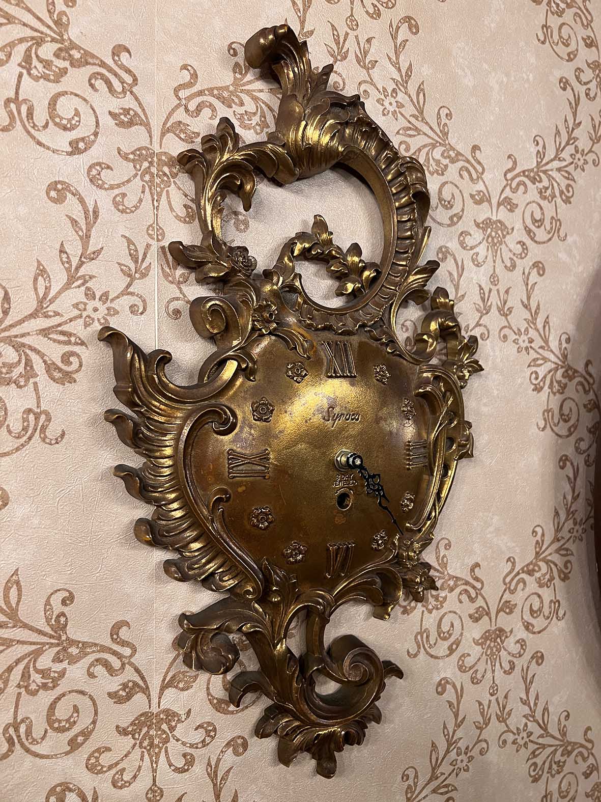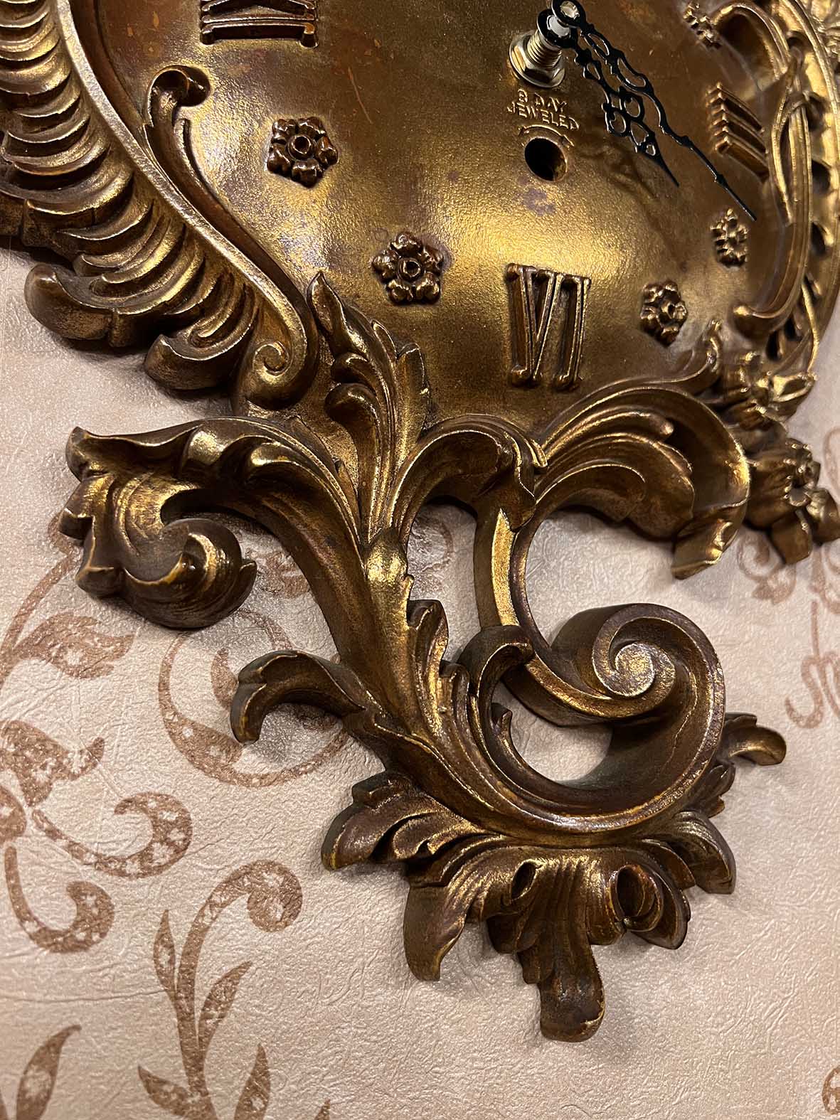 這件來自美國 Syroco(Syracuse Ornamental Company) 的金色浮雕掛鐘,為20世紀中期極具代表性的復古設計。整體造型源自洛可可風格,雕飾流暢優雅、層次豐富,充滿花葉捲紋與貝殼曲線,呈現十八世紀歐陸宮廷風格的浪漫華麗感。