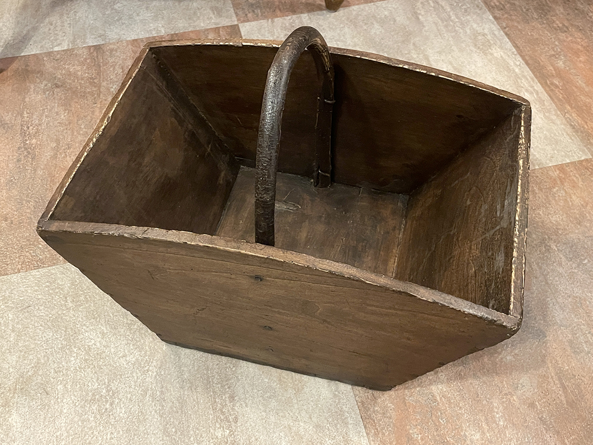 這件重達 2.3 公斤的法國古董手工提籃,為十九世紀末至二十世紀初的鄉村實用木製器具,整體以厚實橡木板手工榫接而成,搭配原生木把手,保留極具年代感的天然木紋與邊緣磨損。寬闊的開口設計與穩重結構,當時被用於農莊或市集中裝載布匹、蔬果或花材的用途。