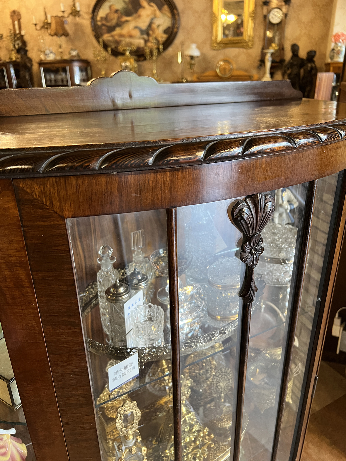 櫃體為少見的橢圓弧形設計,搭配弓形高足與細緻雕刻,更顯柔美流暢。前門與兩側嵌有大量細長切割的鑲嵌玻璃,經由手工鑲框,構成優雅對稱的窗格立面,既能清晰展示收藏,又使整體櫃身輕盈不沉重,展現出卓越的結構設計感與視覺通透感。上緣木框雕飾藤葉紋理,中央以花卉立體雕刻作點綴,細節處盡顯木工技藝精湛。