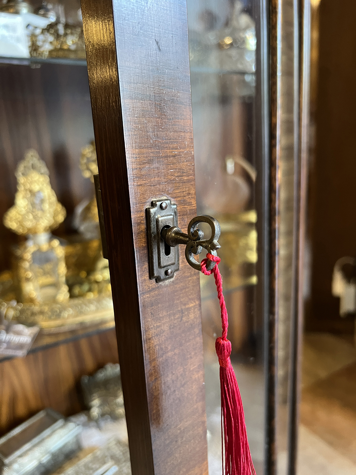 櫃內配置三層玻璃層架,極適合收藏香水瓶、水晶器皿、瓷偶或銀飾盒等精品小物。原裝古董鑰匙與鎖保存完整且可正常使用,增添復古儀式感與使用樂趣。