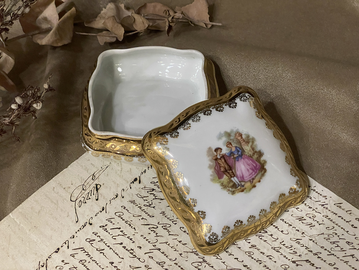 這件來自 法國 Limoges(里摩日) 的瓷器珠寶盒,以柔美的方形波浪盒身搭配 24K 金彩手工描邊,展現典雅華貴的工藝氣息。盒蓋中央繪製一對 戀愛中的情侶圖案,以巴洛克風情的柔和色彩勾勒,傳遞出浪漫情懷與法式生活美學。