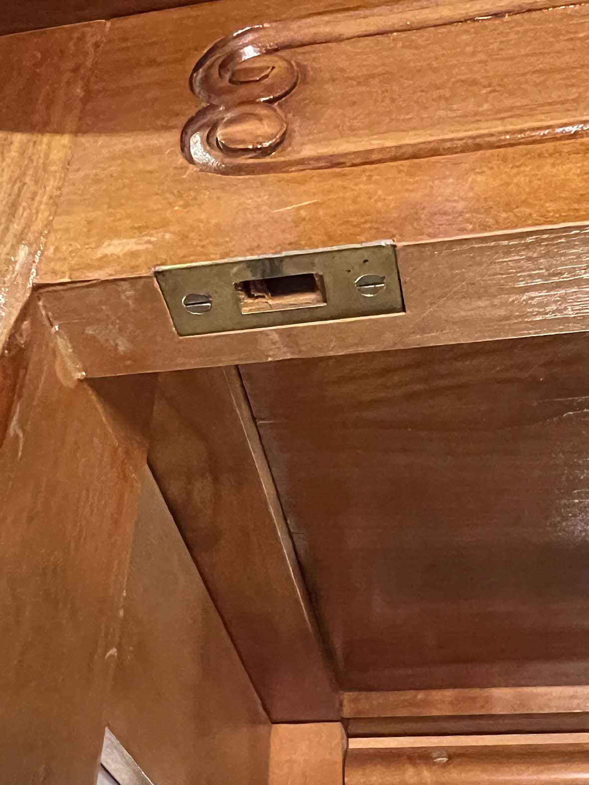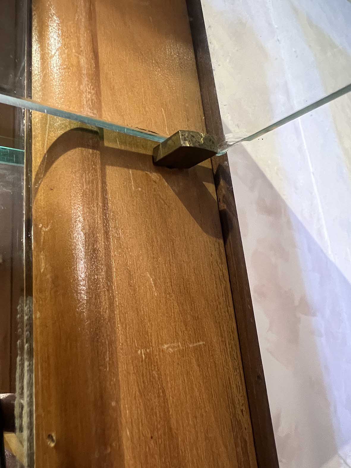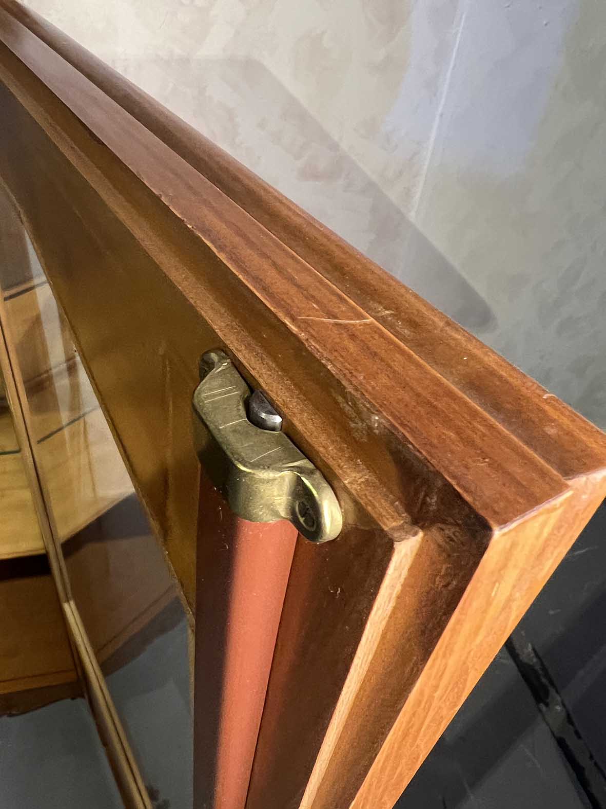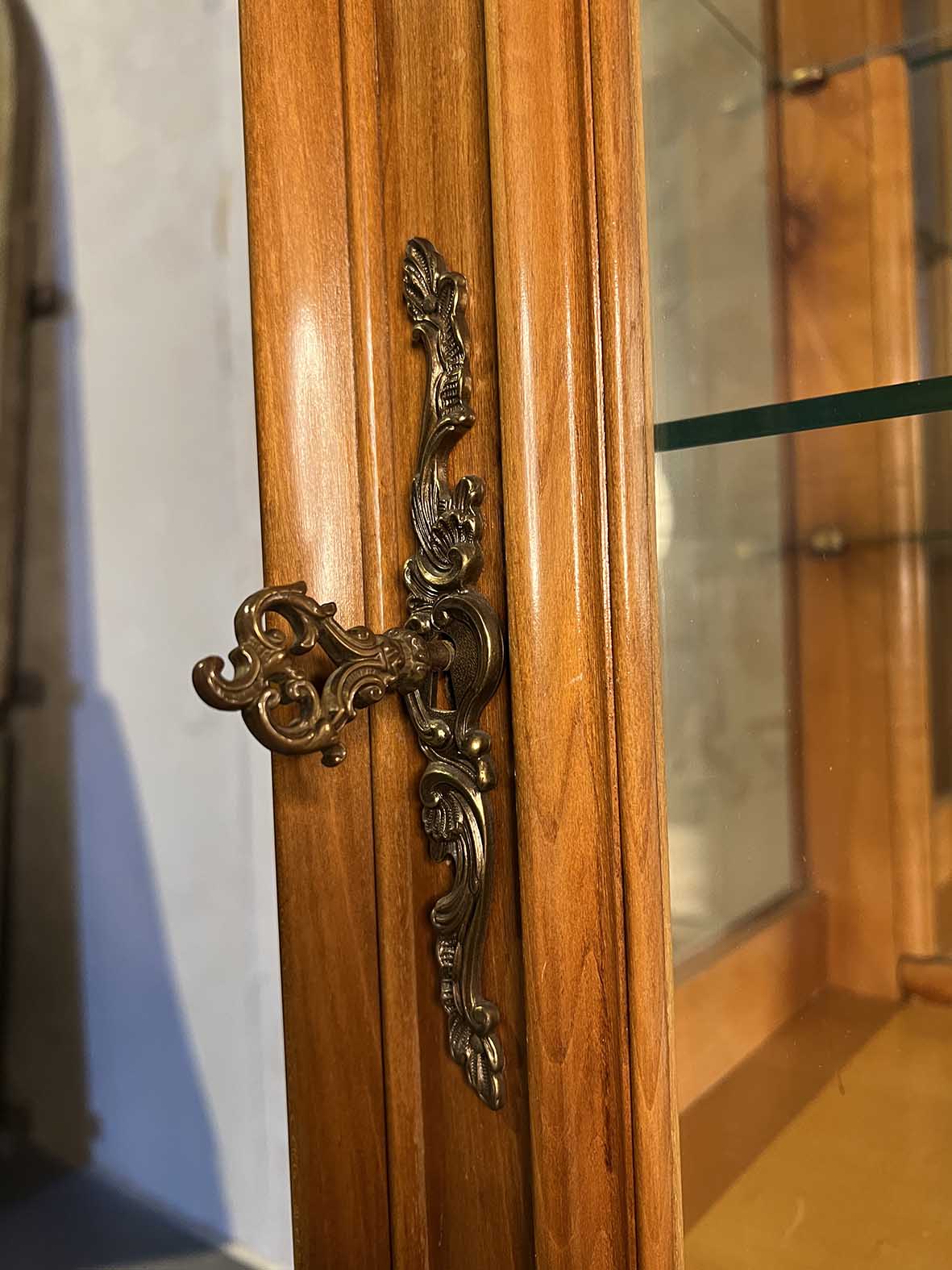 此櫃兼具觀賞與實用價值,內部配置兩層玻璃層架與一層木層板,適合陳列瓷器、玻璃藝品或小型雕刻作品。櫃門配有精工黃銅上下鎖具與裝飾拉把,細節處可見工匠精湛技藝。由於高度適中,亦可作為玄關、走廊或書房空間中的焦點家具。