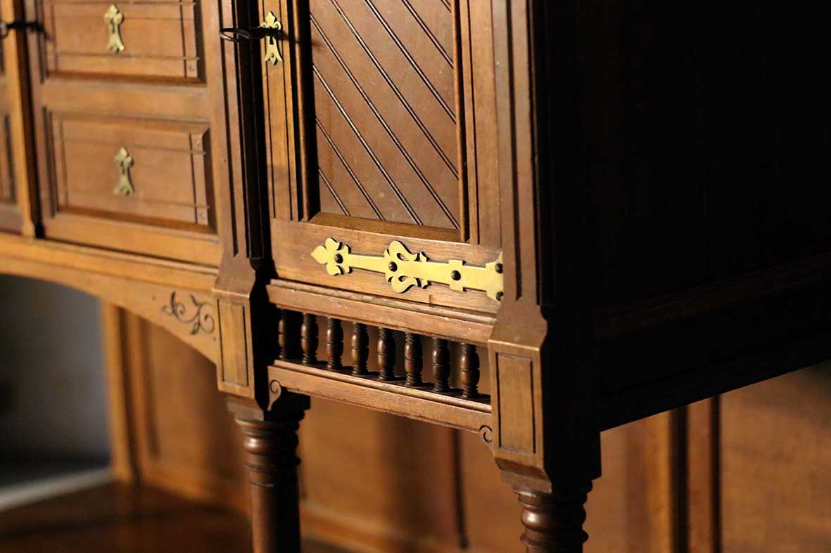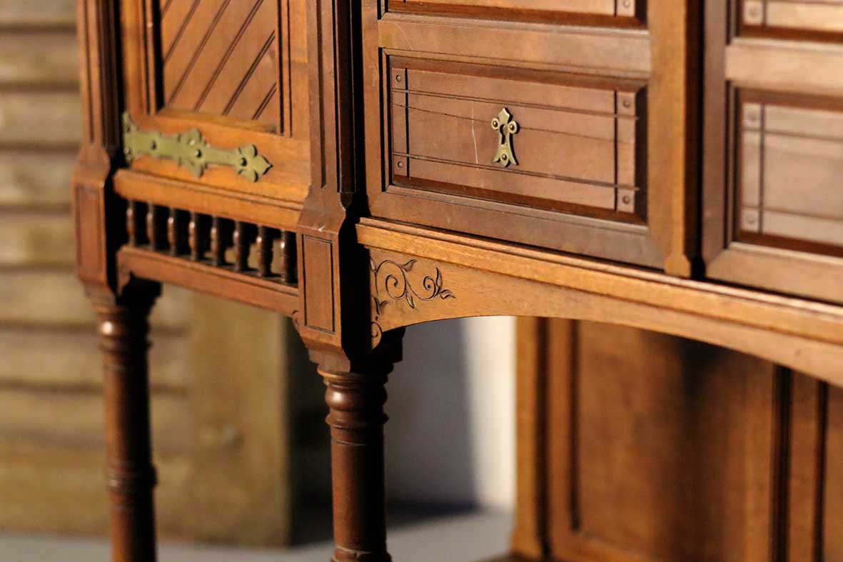 櫃體以堅實的法國橡木打造,木紋清晰,色澤溫潤自然,並保留歷史歲月的光澤與痕跡。