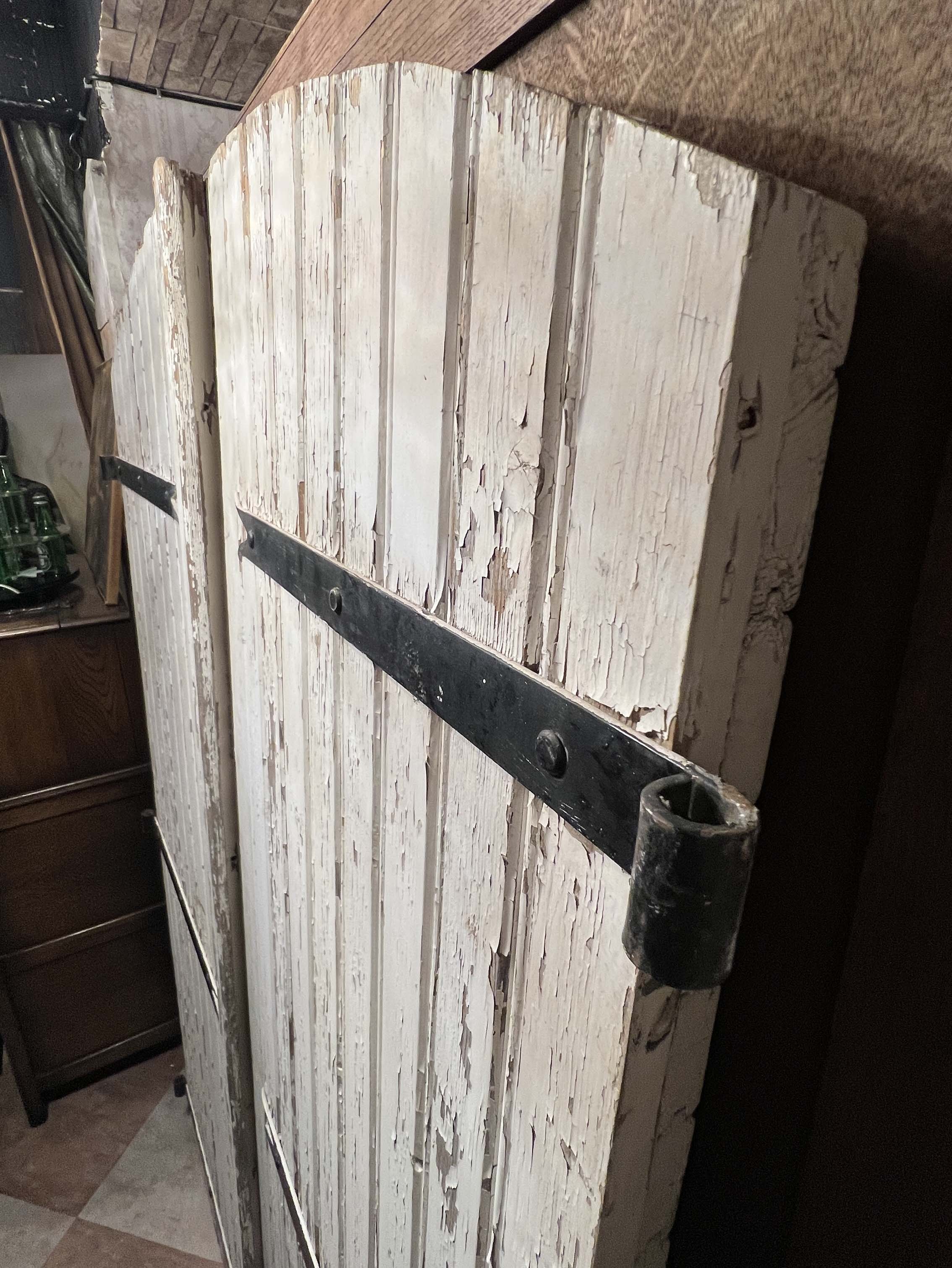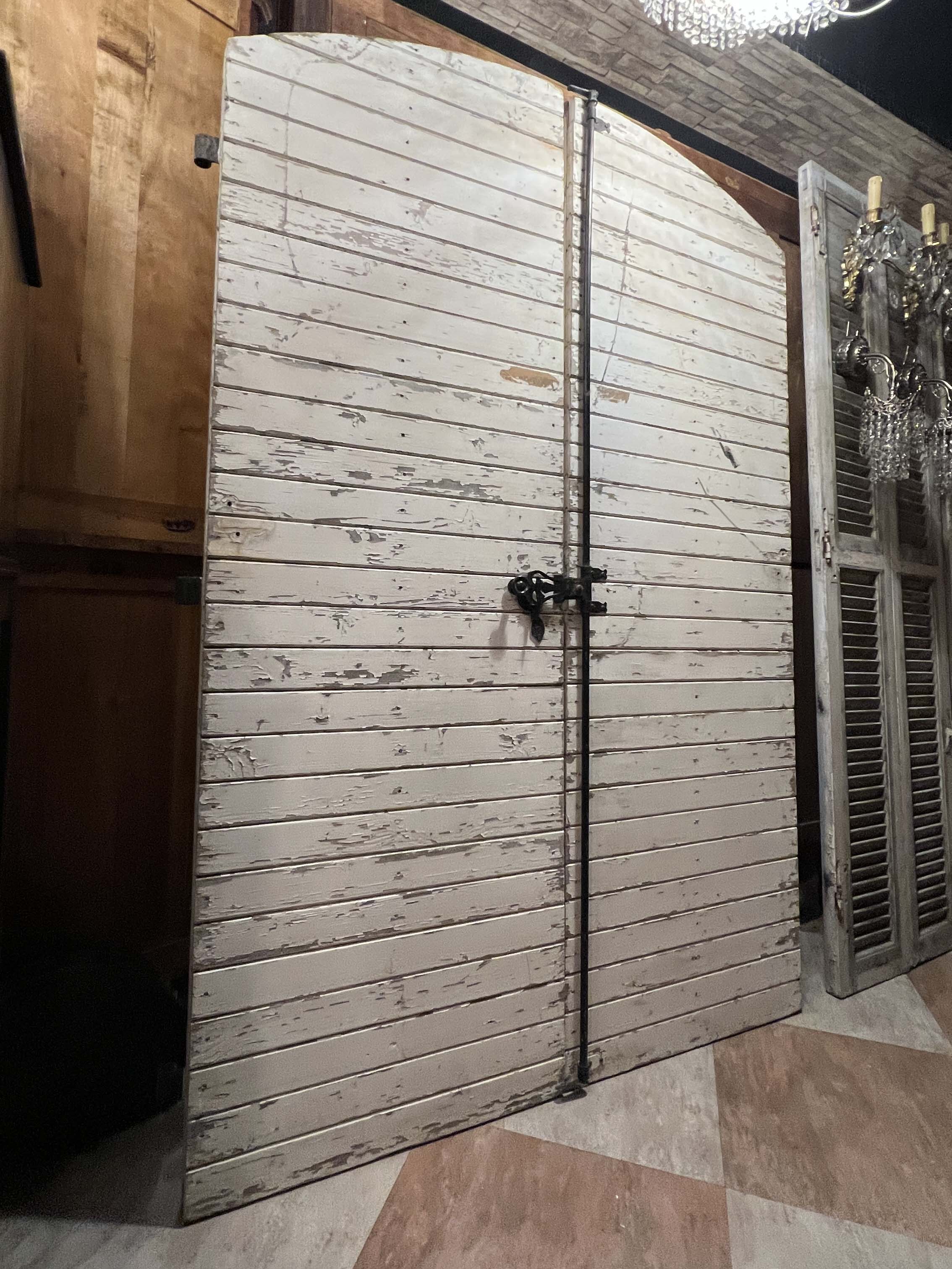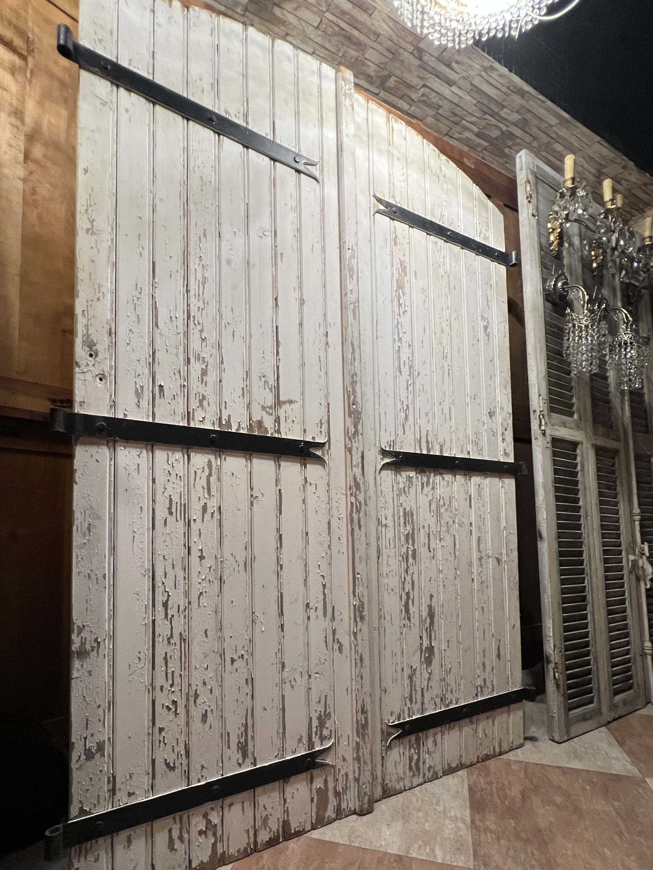 這類雙扇木門可見於法國南部與西部地區的鄉村糧倉、馬廄與穀倉,門扇多以堅實木板組成,為便於開關與強化結構,常見拱頂設計與外部金屬橫桿補強。此次保存件不僅完整保留原始油漆斑駁痕跡與歲月風化,亦具備原始的鍛鐵門栓、橫桿與鉸鍊系統,是極少見的整組完整保存的夢幻逸品。