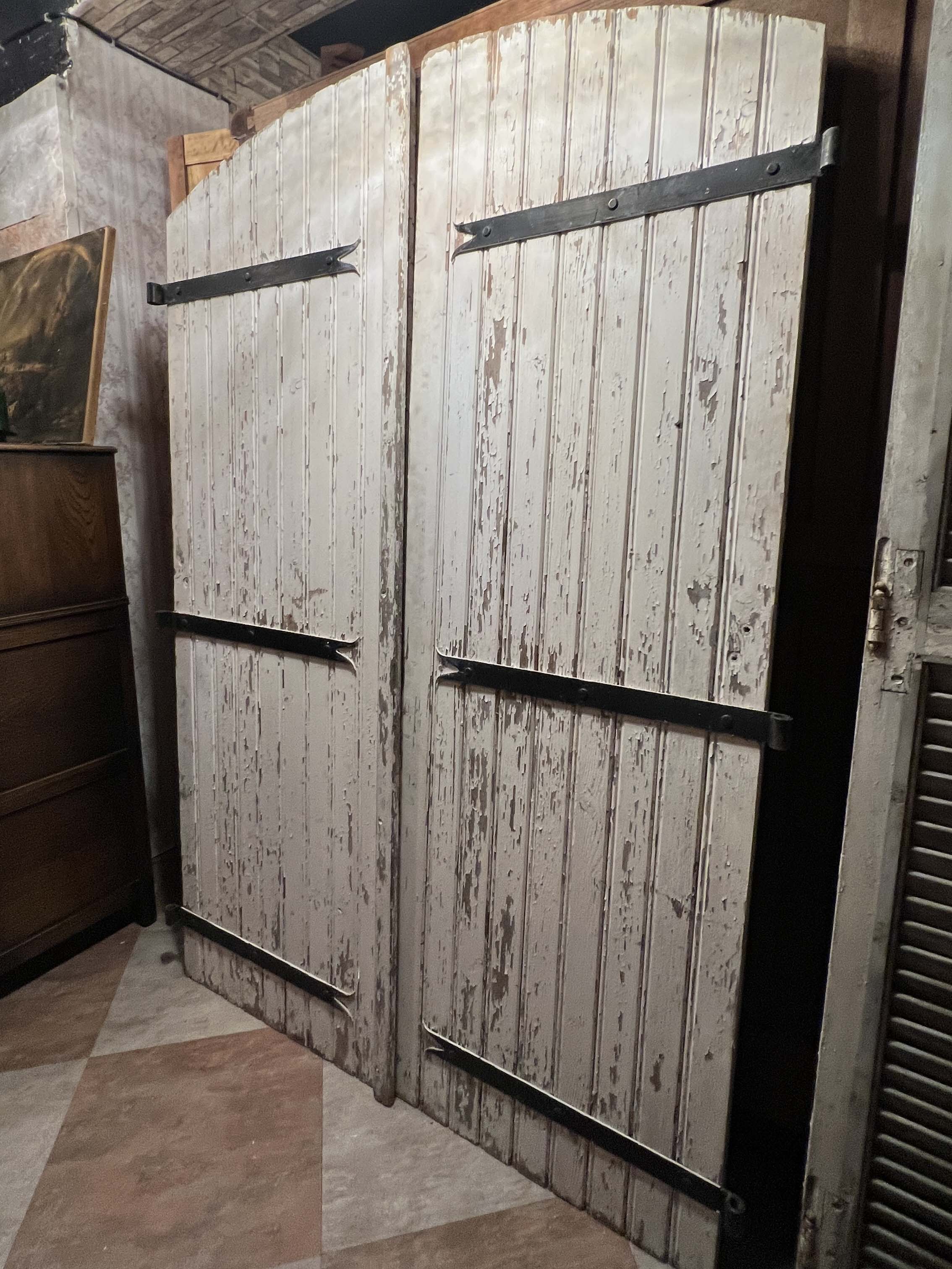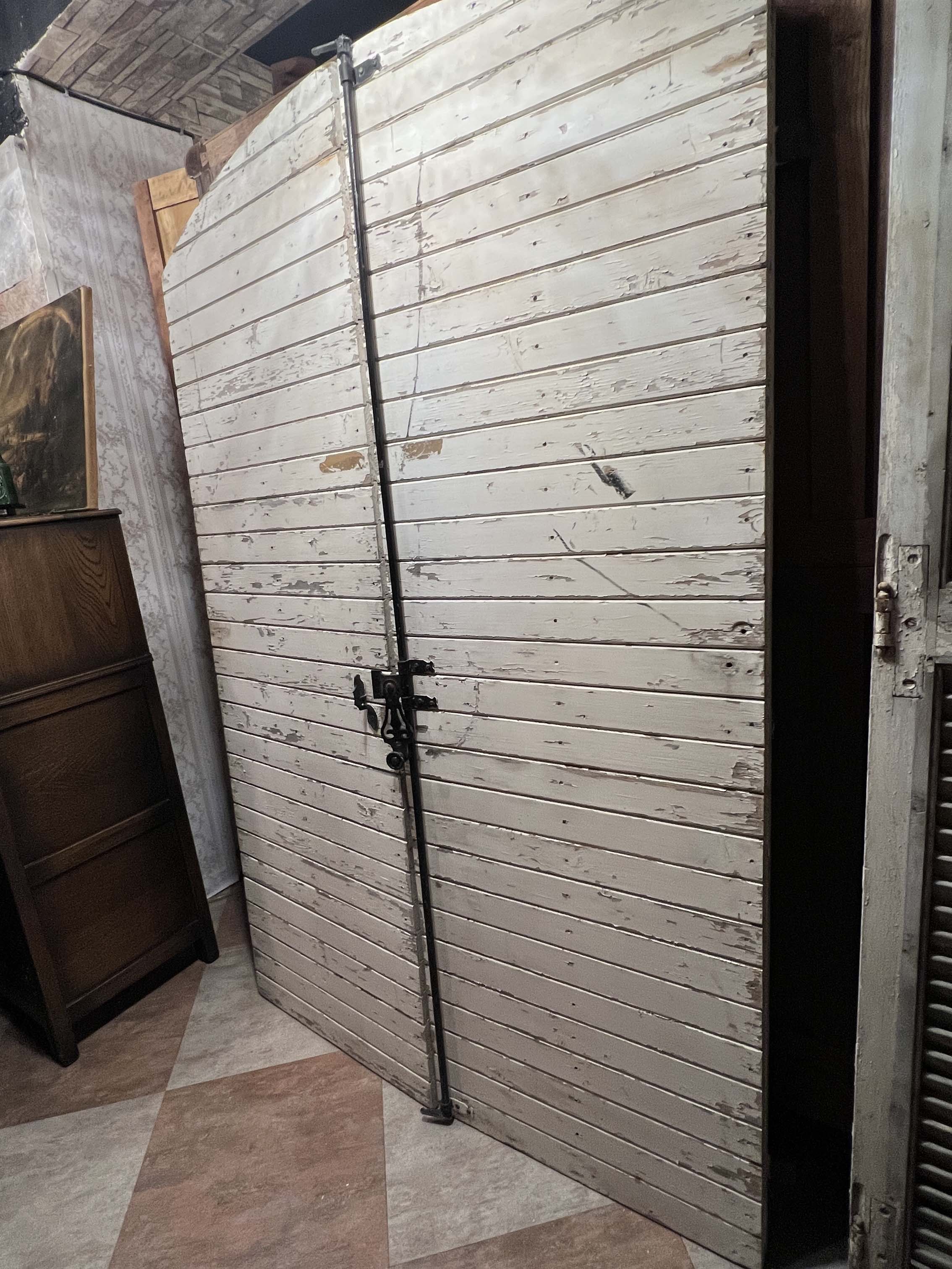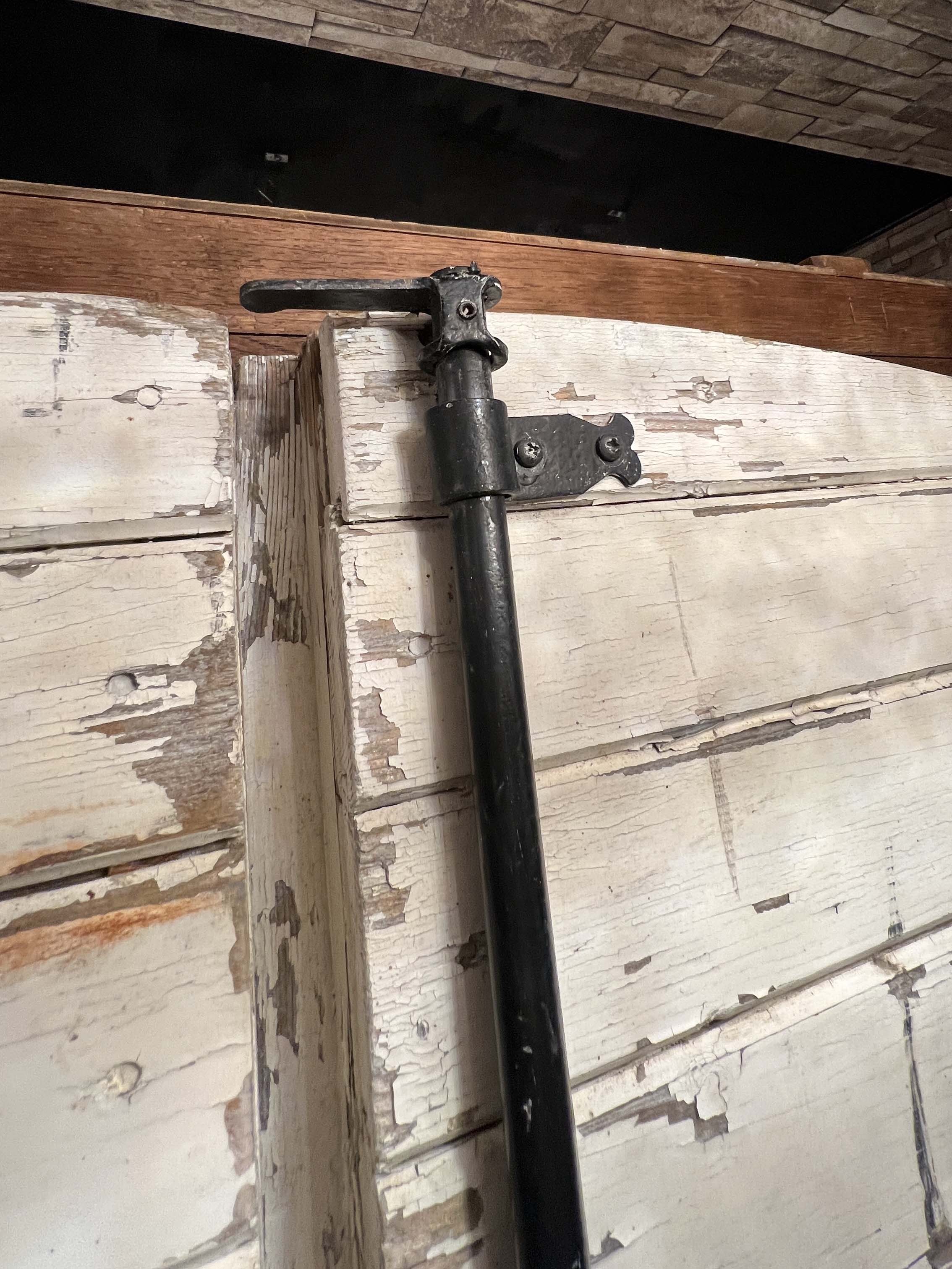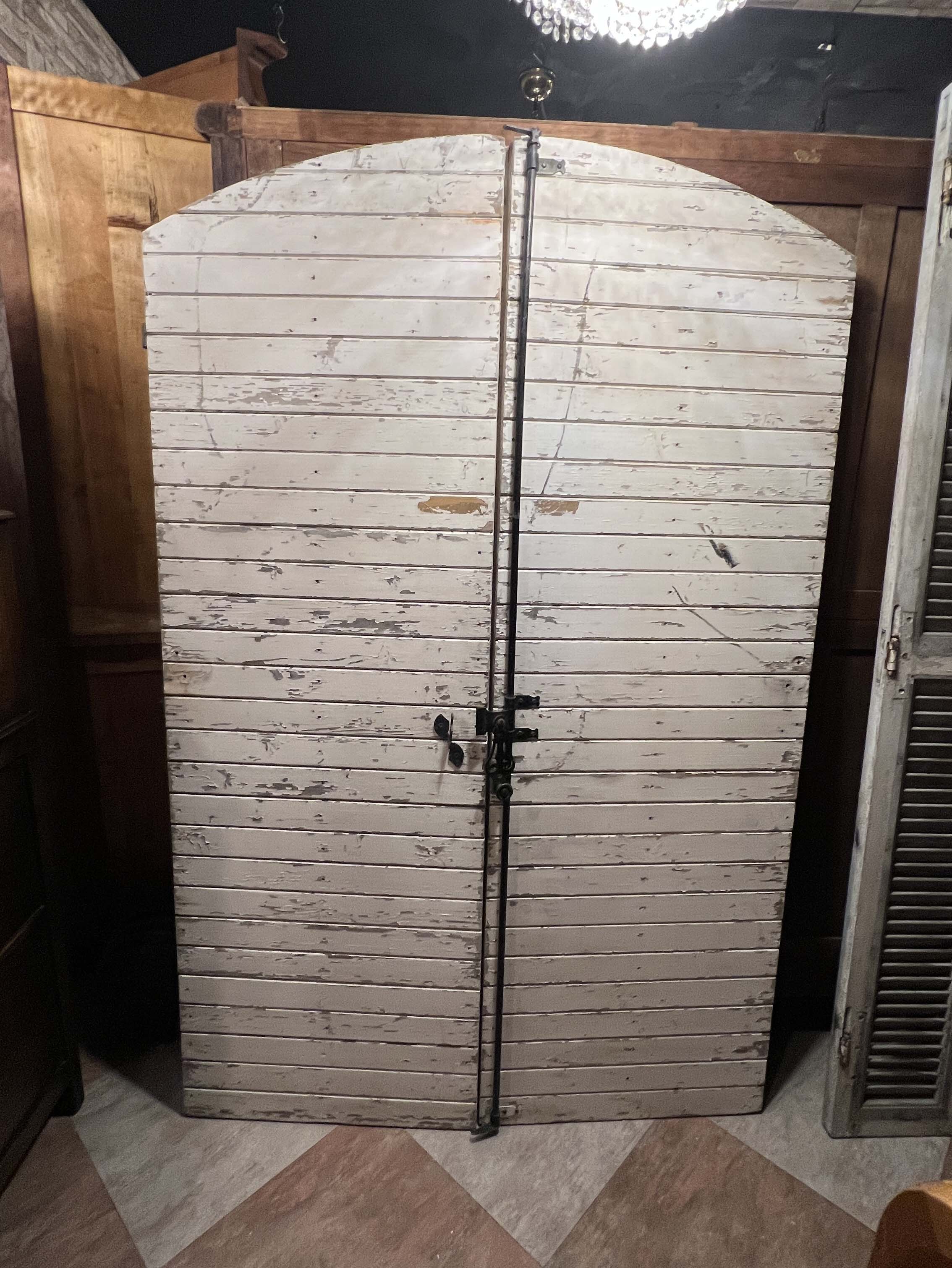這類雙扇木門可見於法國南部與西部地區的鄉村糧倉、馬廄與穀倉,門扇多以堅實木板組成,為便於開關與強化結構,常見拱頂設計與外部金屬橫桿補強。此次保存件不僅完整保留原始油漆斑駁痕跡與歲月風化,亦具備原始的鍛鐵門栓、橫桿與鉸鍊系統,是極少見的整組完整保存的夢幻逸品。