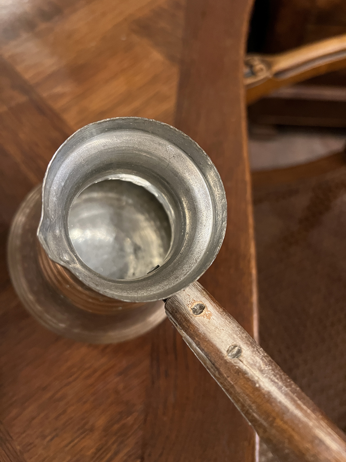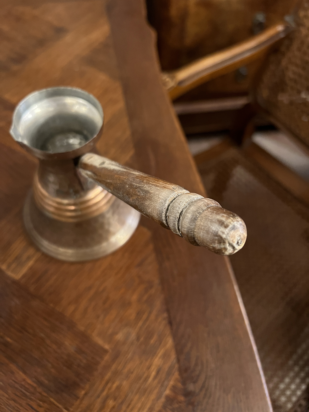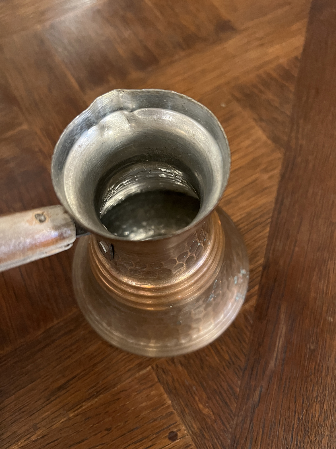 這把是典型的土耳其咖啡壺(cezve)比例,下寬上收,為的就是讓咖啡在加熱時泡沫集中、慢慢往上推。傳統做法會把壺放在熱沙上加熱,香氣和泡沫都更細緻,有一種很老派、很迷人的耐心。