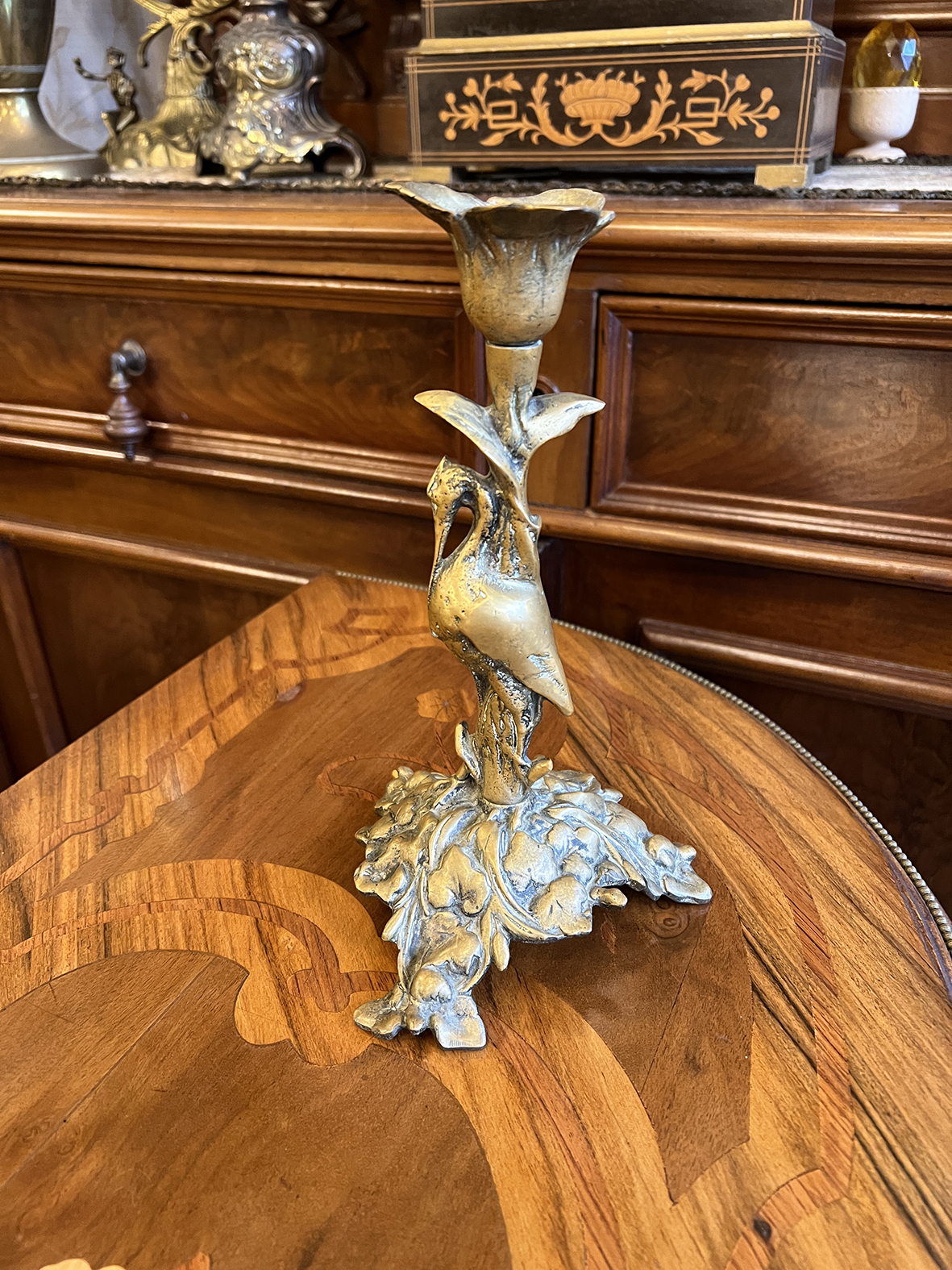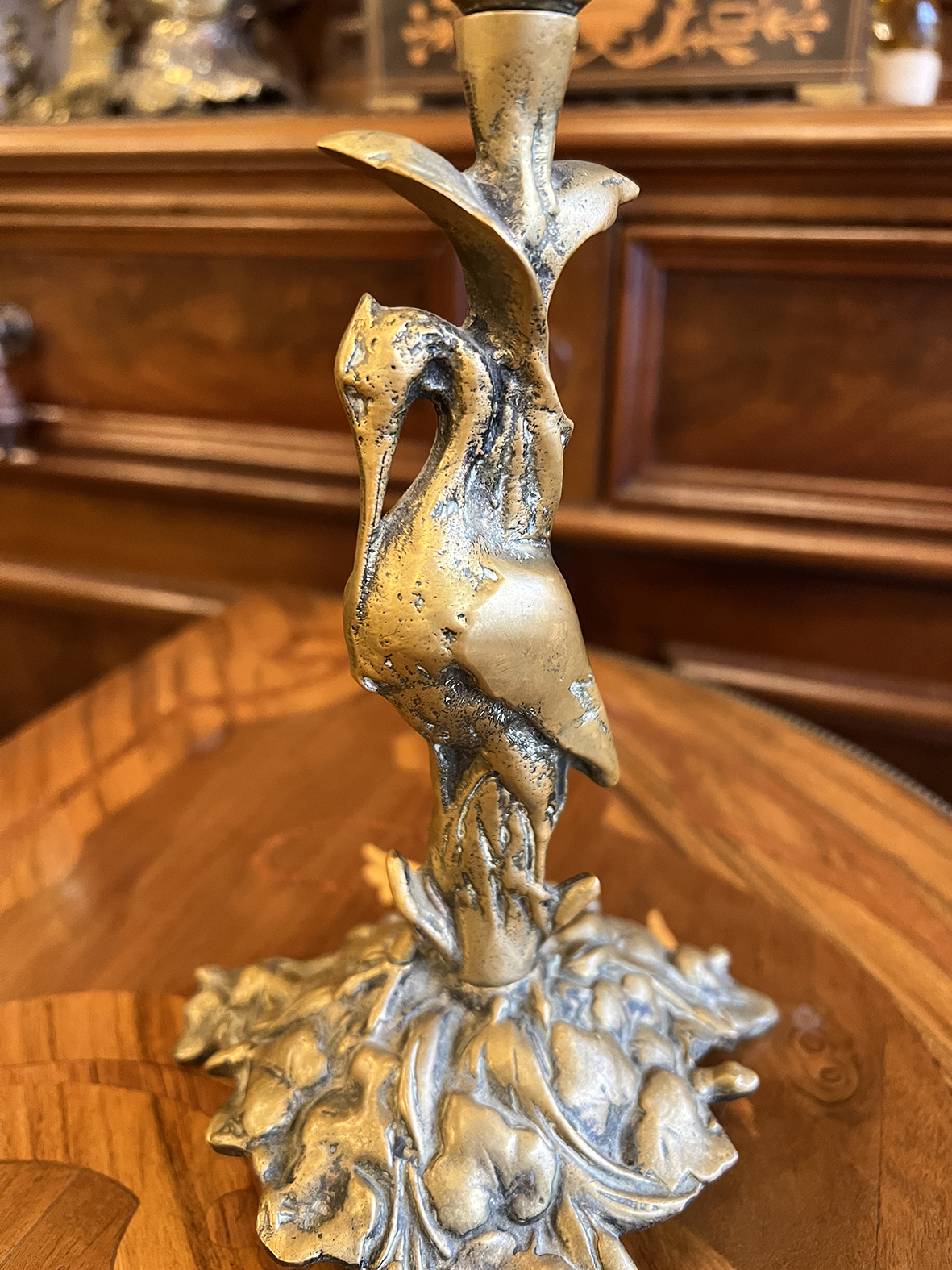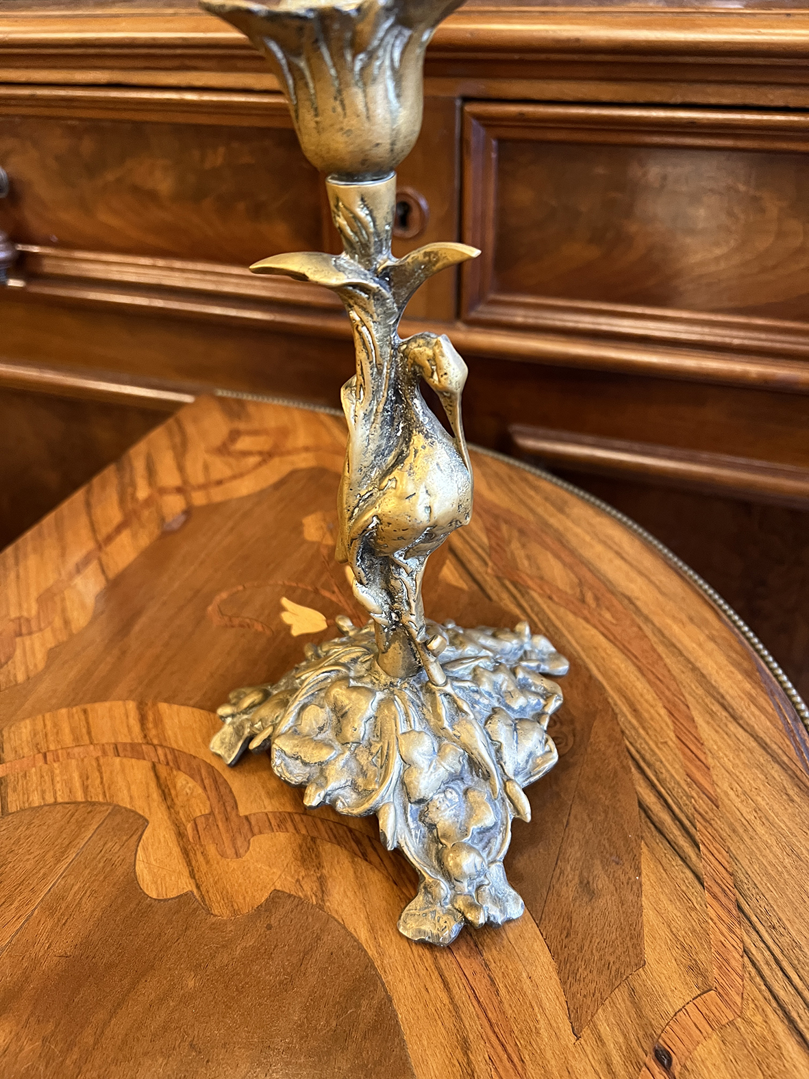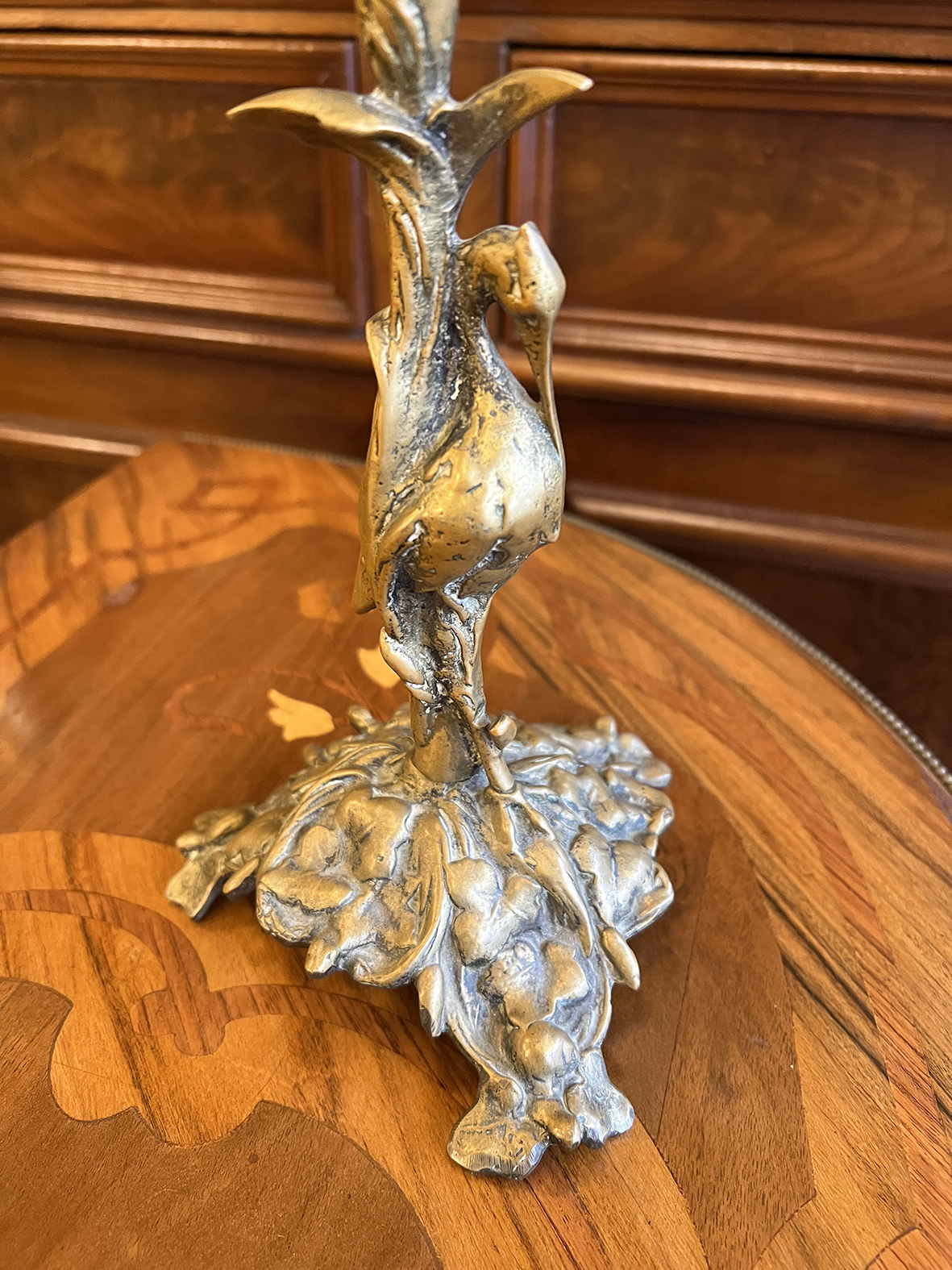 整體造型如一株向上生長的花莖,鸛鳥優雅地倚靠其上。鳥喙修長,姿態充滿張力,羽毛以細膩的鑄造肌理呈現,帶有自然流動感。上方花形燭杯像含苞待放的花朵,與下方厚實的葉片基座呼應,形成典型的新藝術「植物化結構」。