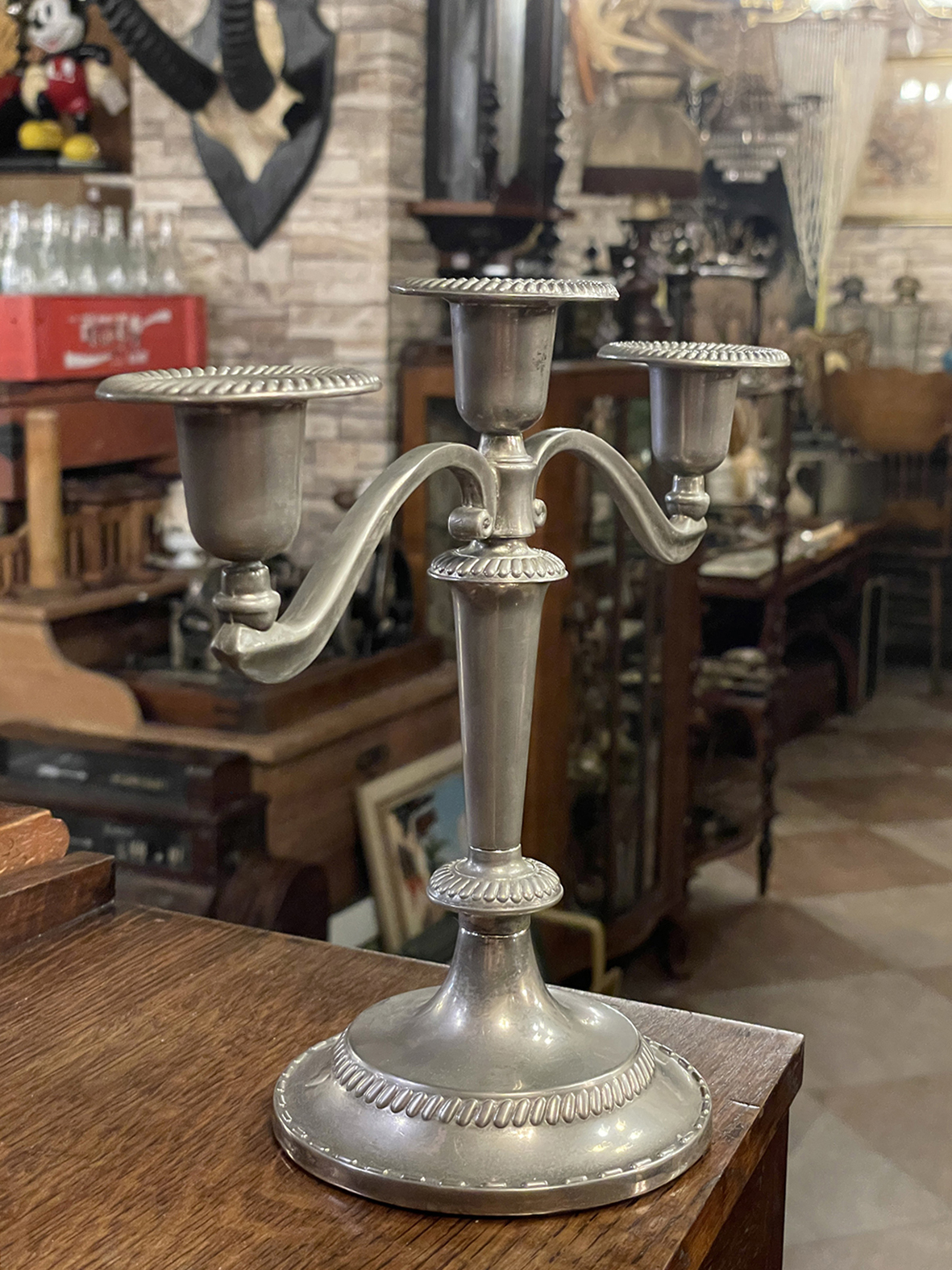 這件來自英國的古董三口燭台,以對稱弧形橫臂設計為主體,展現18至19世紀餐桌銀器中常見的典雅風格。