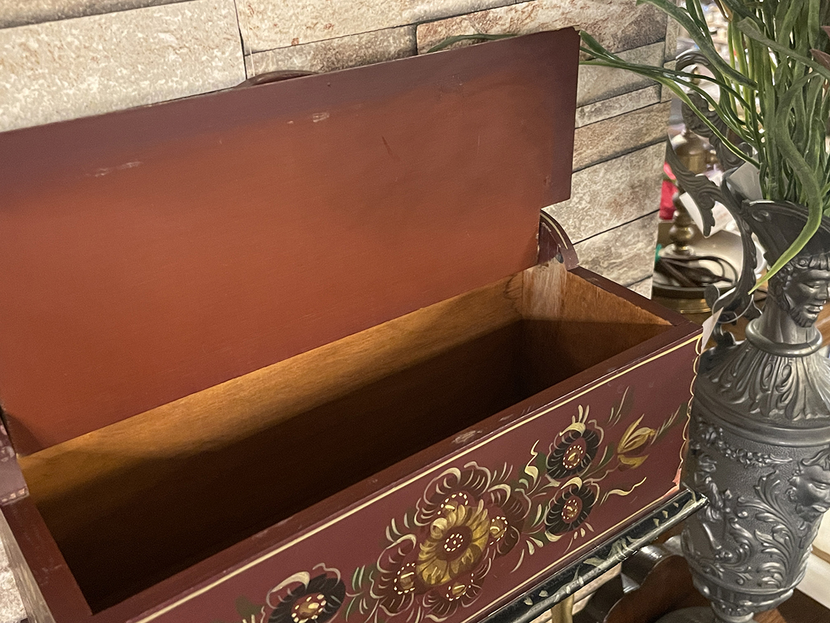 本件以實木製成,盒體結構厚實穩固,表面以手工彩繪花卉圖案點綴,展現典型的 Hindeloopen 風格特徵:柔和紅褐為底色,配以黃、綠、墨黑、赭紅交織構成的鬱金香與玫瑰形花朵,花形曲線流暢,搭配金色描邊與鏤空波浪形上沿,增添古典鄉村的柔美氣息。
