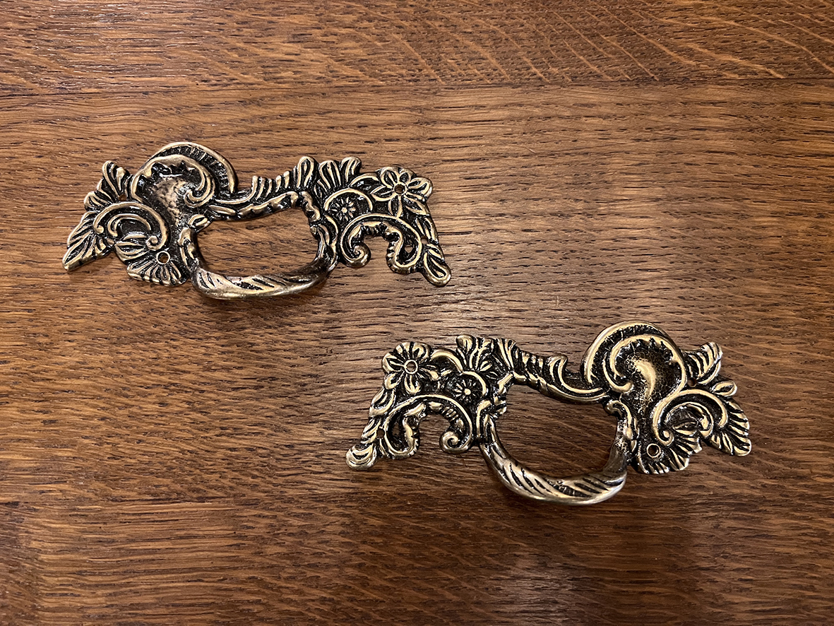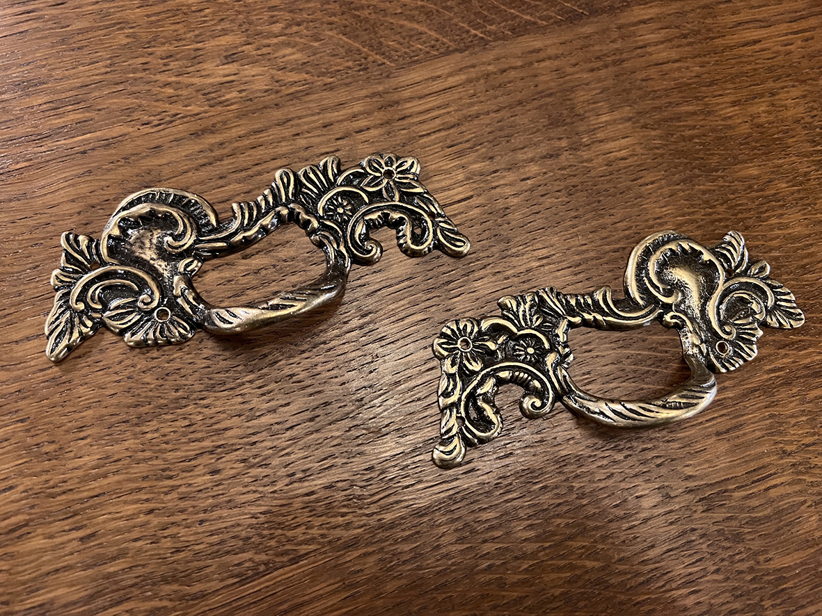 這組手把來自法國,超過百年歷史,採用典型的巴洛克風格設計。其特徵是繁複的花葉紋飾、優雅的曲線與對稱的浮雕細節,為18–19世紀歐洲家具經典的華麗裝飾。以黃銅手工鑄造而成,帶有自然氧化的深淺色澤,既能作為抽屜或櫥櫃的功能性五金,也具備極高的裝飾與收藏價值。