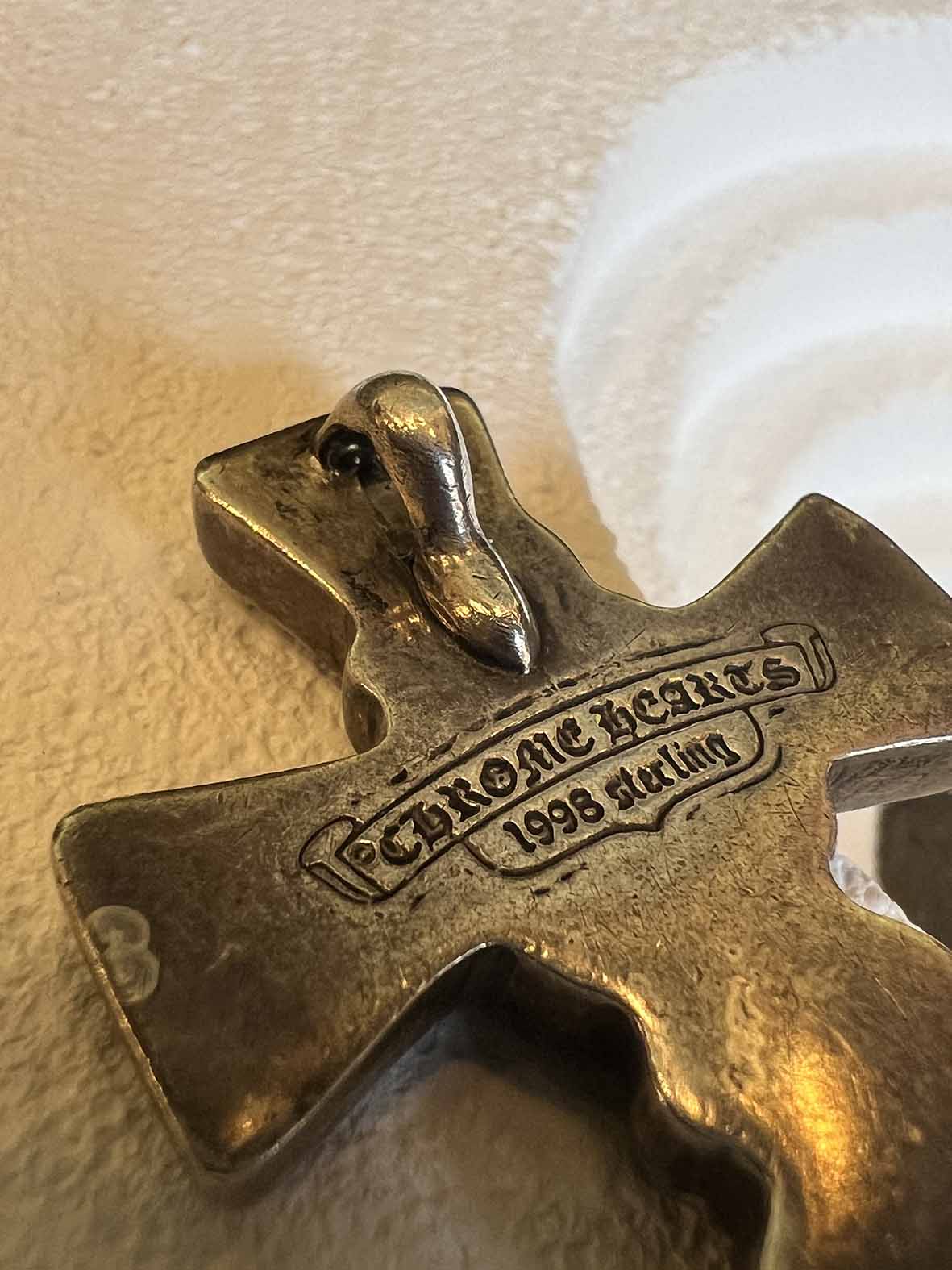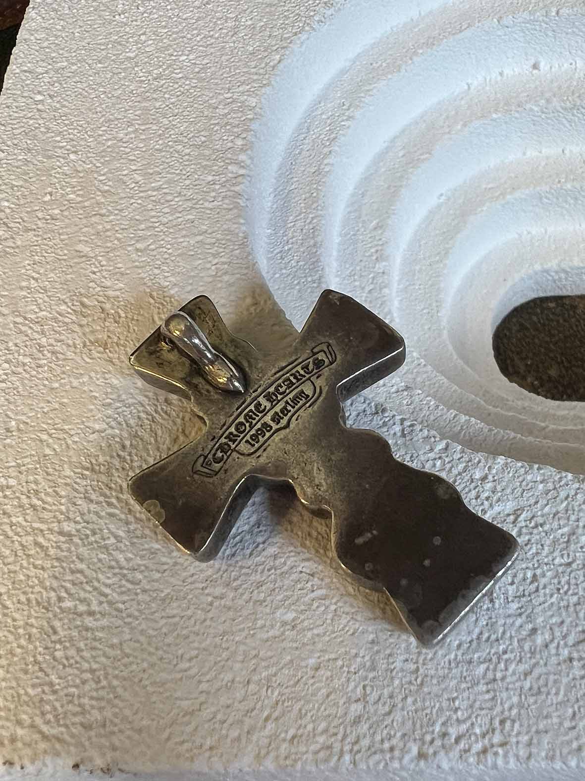 背面刻有品牌經典標記(CHROME HEARTS、1998、Sterling),字體保留手工雕刻的不規則深淺與邊緣感,隨時間使用呈現自然磨損,讓整體更具老件氛圍與收藏價值。
