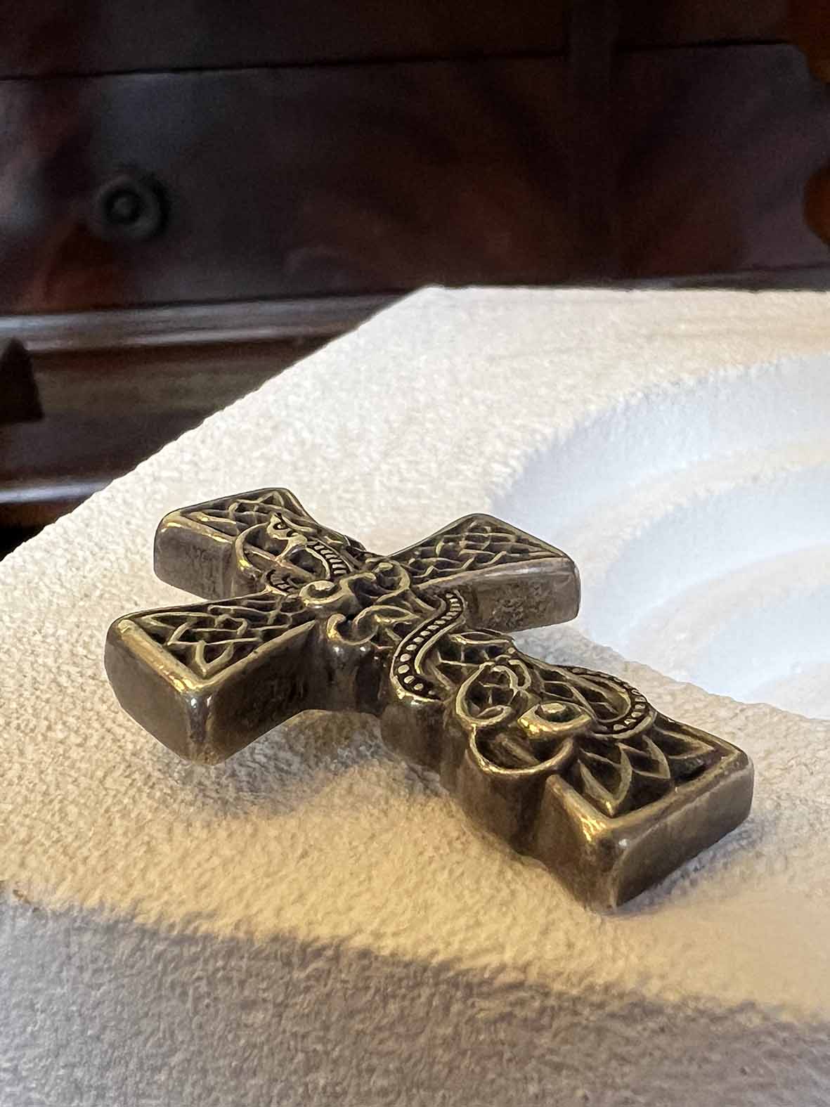 十字四端外擴,比例厚實飽滿,邊緣圓潤不銳利,展現出 Chrome Hearts 一貫的手工蠟模翻鑄工藝。正面交織紋路具有明顯層次,線條之間帶有穿插與起伏,不是平面壓紋,而是帶有雕塑感的立體構成。佩戴時隨著光線變化,凹槽處呈現深色氧化,凸面則自然拋光,形成強烈對比,視覺張力十足。