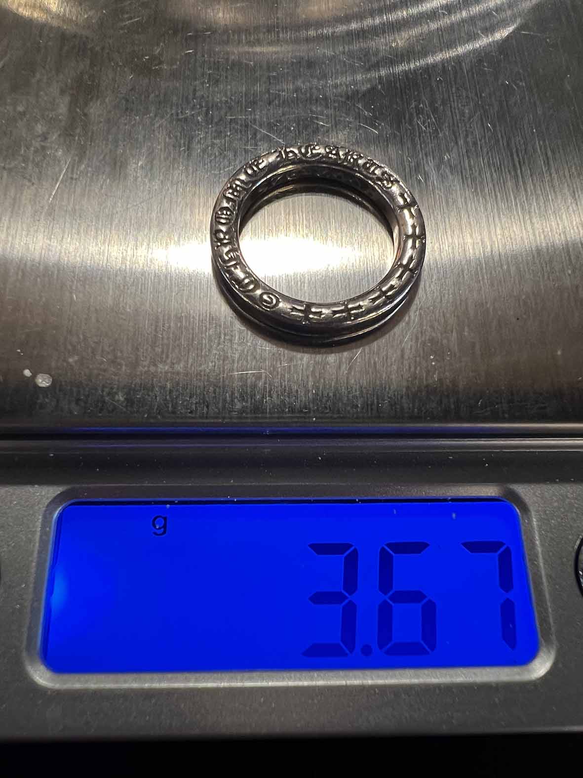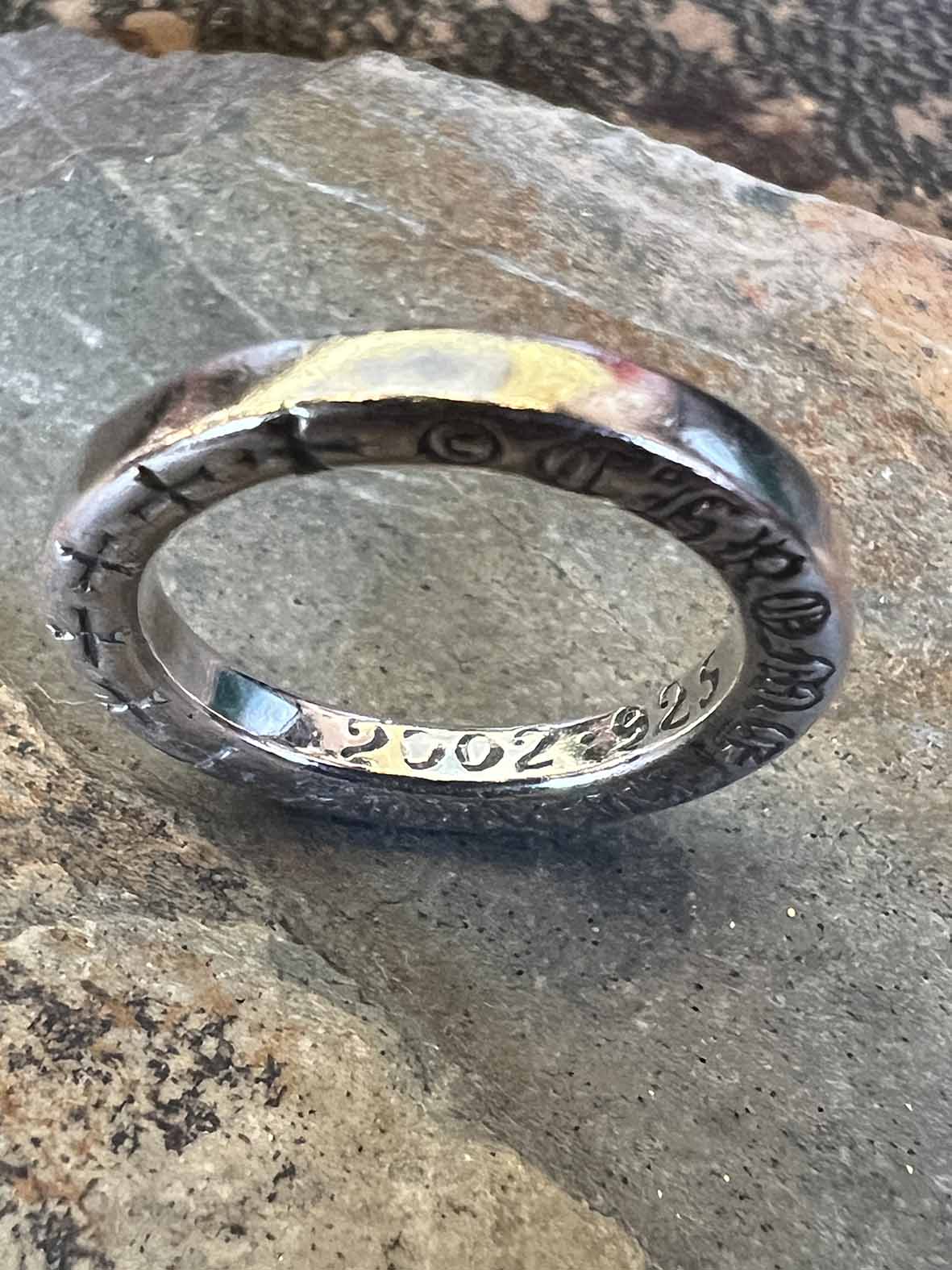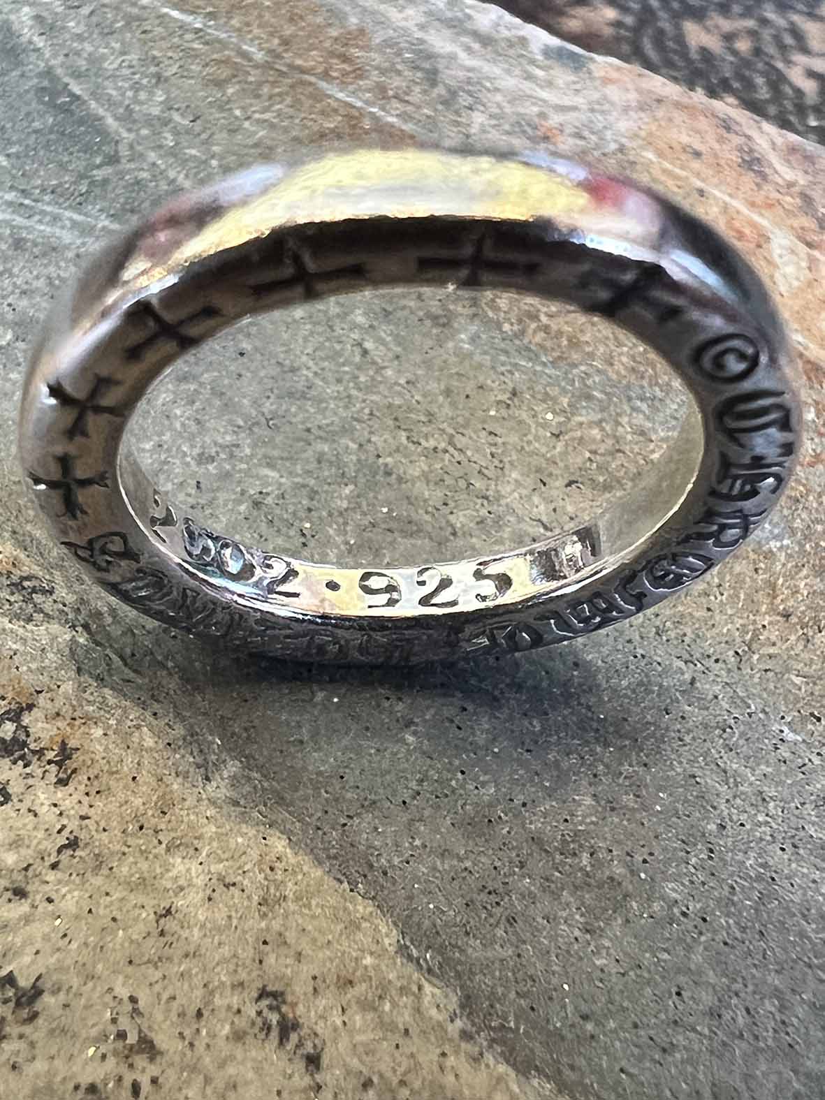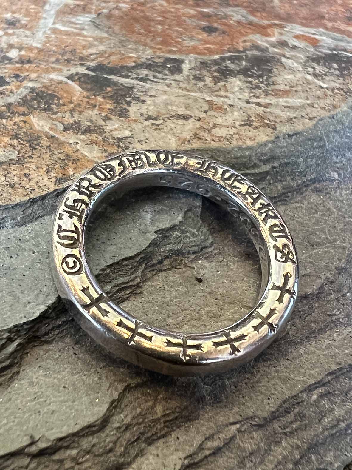 這件 Chrome Hearts NTFL 窄版戒,是品牌長年市場中最穩定、流通性最高的一款。細版圓環結構搭配完整刻字與十字分隔,將 Chrome Hearts 的哥德語彙濃縮在最乾淨的比例之中。
