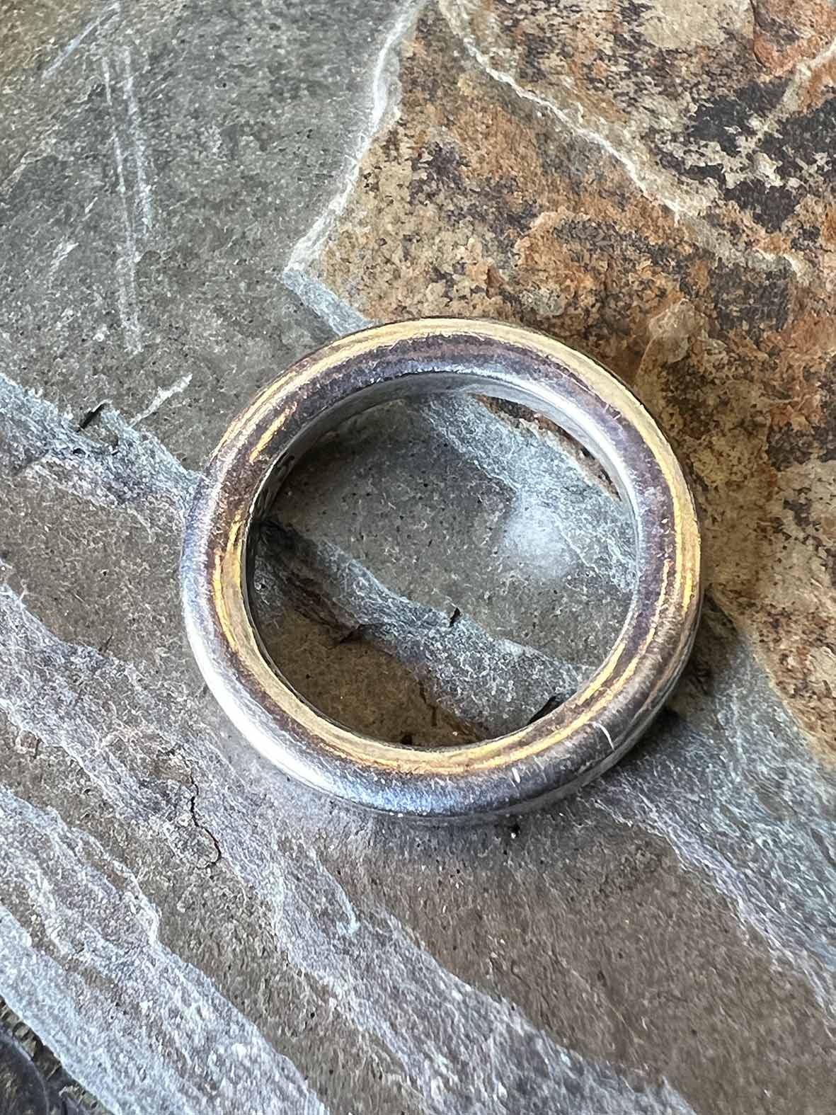 相較常見粗版戒,這款窄版更貼手、耐戴,也更適合日常長時間配戴。刻字保有明顯手工雕刻感,深淺不一的刀痕與自然氧化層,讓整體呈現出老件特有的立體層次與銀飾溫潤光澤。
