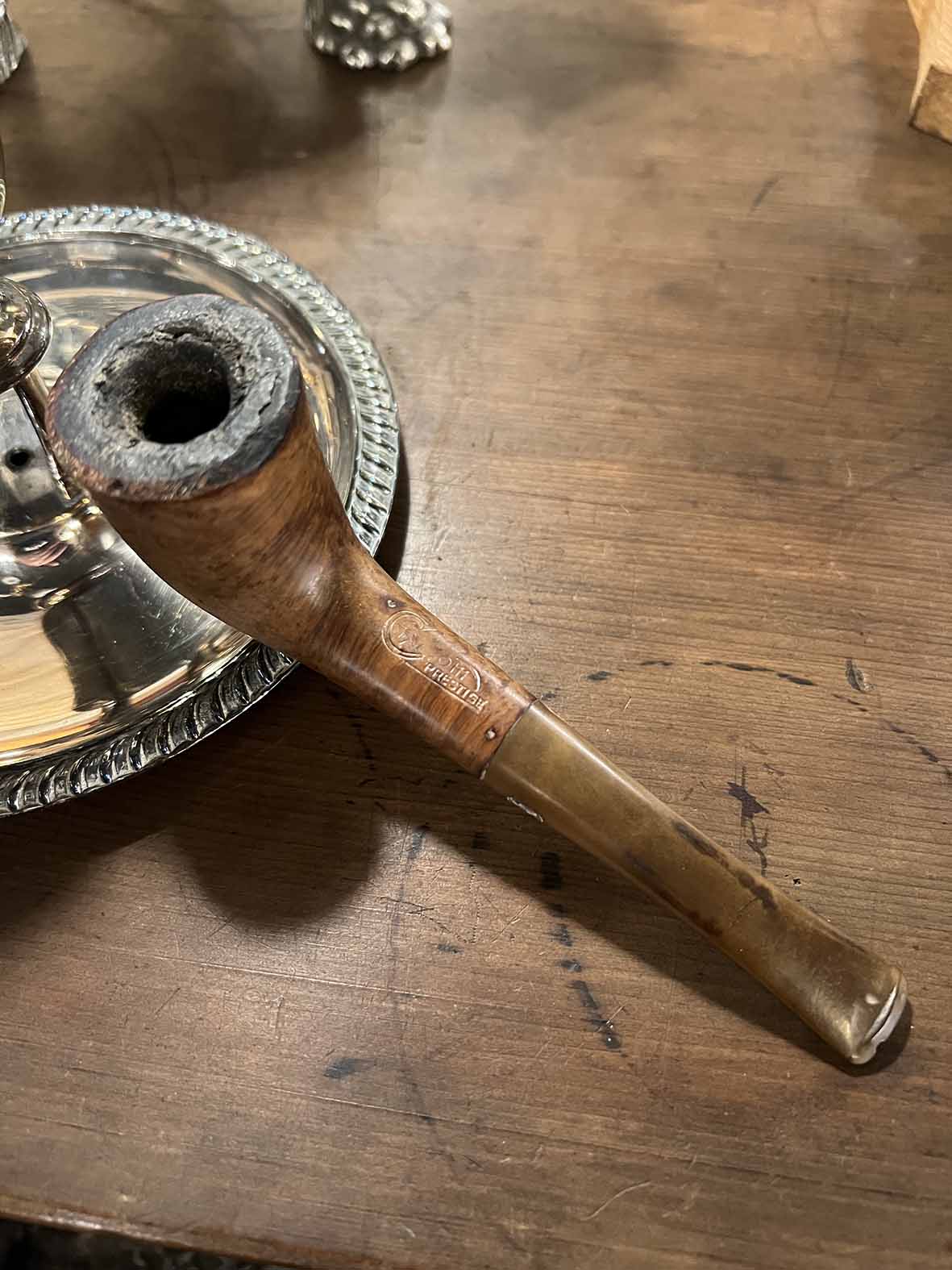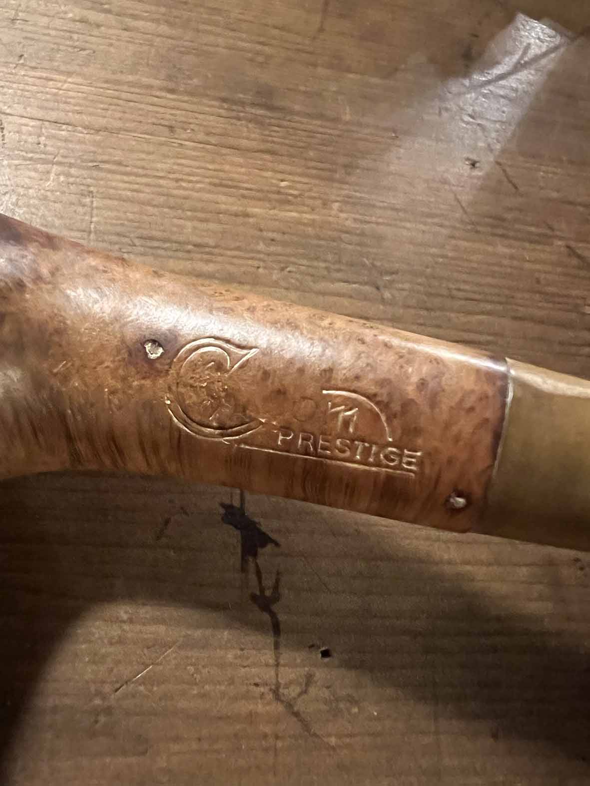 煙桿部分為弧形設計,搭配膠木煙嘴,色澤偏棕黑,帶有年代感。連接處可見品牌壓印(PRESTIGE),屬於歐洲中高階手工菸斗品牌系統。