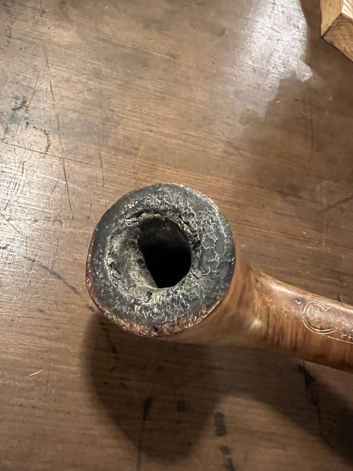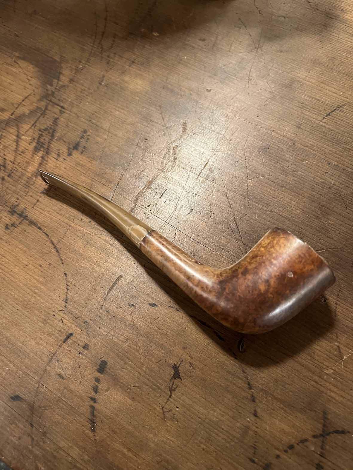 斗頭呈現圓潤微方形輪廓,邊角柔和,經長時間使用後形成深色包漿與自然炭化痕跡,這種使用痕跡反而是老菸斗最迷人的地方。手握時能感受到木質溫度與歲月沉澱出的油潤感。