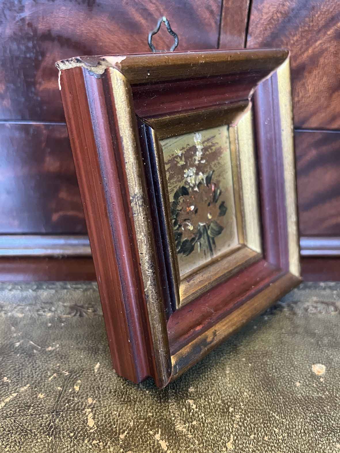 原框是金+紅木色層次的老框,搭配這種小畫很剛好。